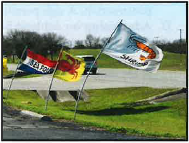 Flag, decorative: A piece of fabric or other similar material in the shape of a flag attached to a pole that contains designs or images that are used as symbols, decorations, or advertisements. Decorative signs often display logos, business names, or other images that attract attention to a business or activity.