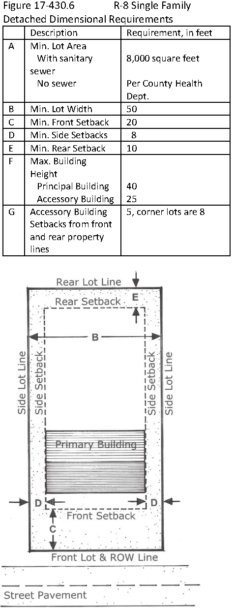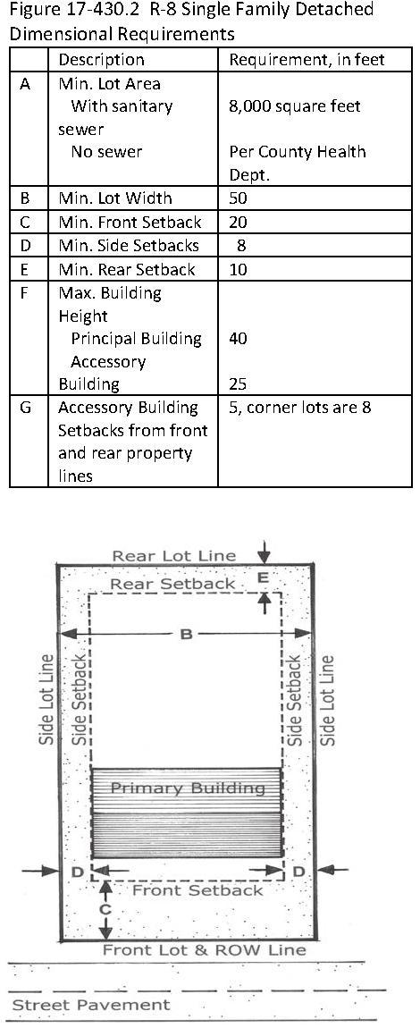 NOTE 5: R-8 and TR. For single family residential minimum lot size is 8,000 square feet; density shall not exceed 5.0 dwelling units per gross acre in the development. Minimum lot size for a duplex is 10,500 square feet.