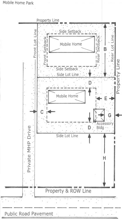 NOTE 8: MHP Setbacks from Lot Lines and Property Boundaries not on streets: Twenty (20) feet from any external mobile home park boundary; Ten (10) feet from any interior lot line. (See Section 17-544.)