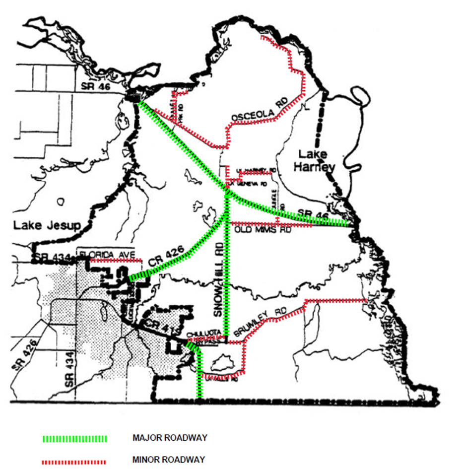 Major roads (as the term is used in this Part): County Road 419 from Lockwood Road to the Seminole County line, State Road 46 from Lake Jesup to the Seminole County line, County Road 426 from State Road 434 east to the Seminole County line, and the entire length of Snowhill Road.