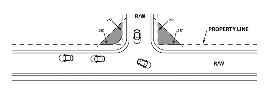 Fences, walls, hedges, plantings, or other obstructions must maintain visual clearance requirements at the intersection on corner lots. The visual clearance triangle must be fifteen (15) feet for residentially and agriculturally zoned property, or twenty-five (25) feet for commercially or industrially zoned property at a street intersection unless otherwise approved by the County Engineer. The visual clearance triangle is measured from the property corner adjoining the intersection of rights-of-way the distance described above with a line joining points on those lines.