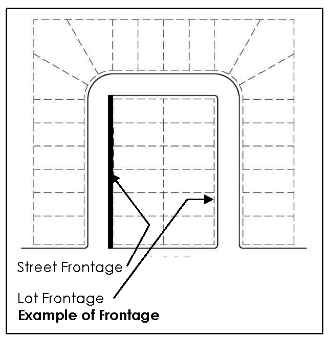 STREET FRONTAGE shall mean the distance for which a property line adjoins a public street from one property line intersecting said street to the opposite property.