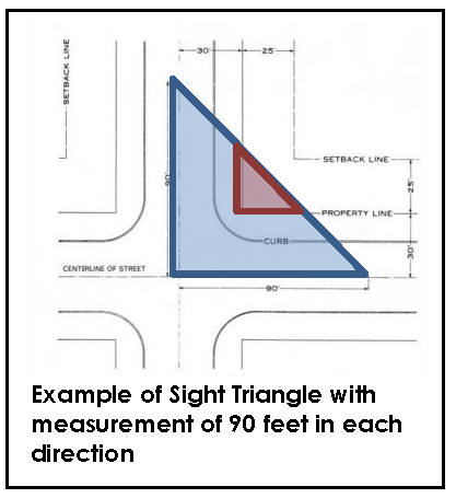 VIBRATION shall mean the periodic displacement measured in inches of the ground. VIBRATION, FREQUENCY shall mean the number of oscillations per minute of a vibration. VISUAL OBSTRUCTION shall mean any fence, hedge, tree, shrub, wall or structure exceeding two feet in height, measured from the crown of intersecting or intercepting streets, alleys or driveways, which limit the visibility of persons in motor vehicles on said streets, alleys, or driveways. This does not include trees kept trimmed of branches below a minimum height of eight feet.