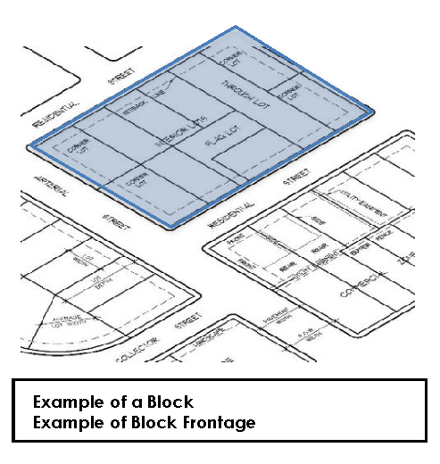 BLOCK FRONTAGE shall mean that section of a block fronting on a street between two intersecting streets or other block boundary.