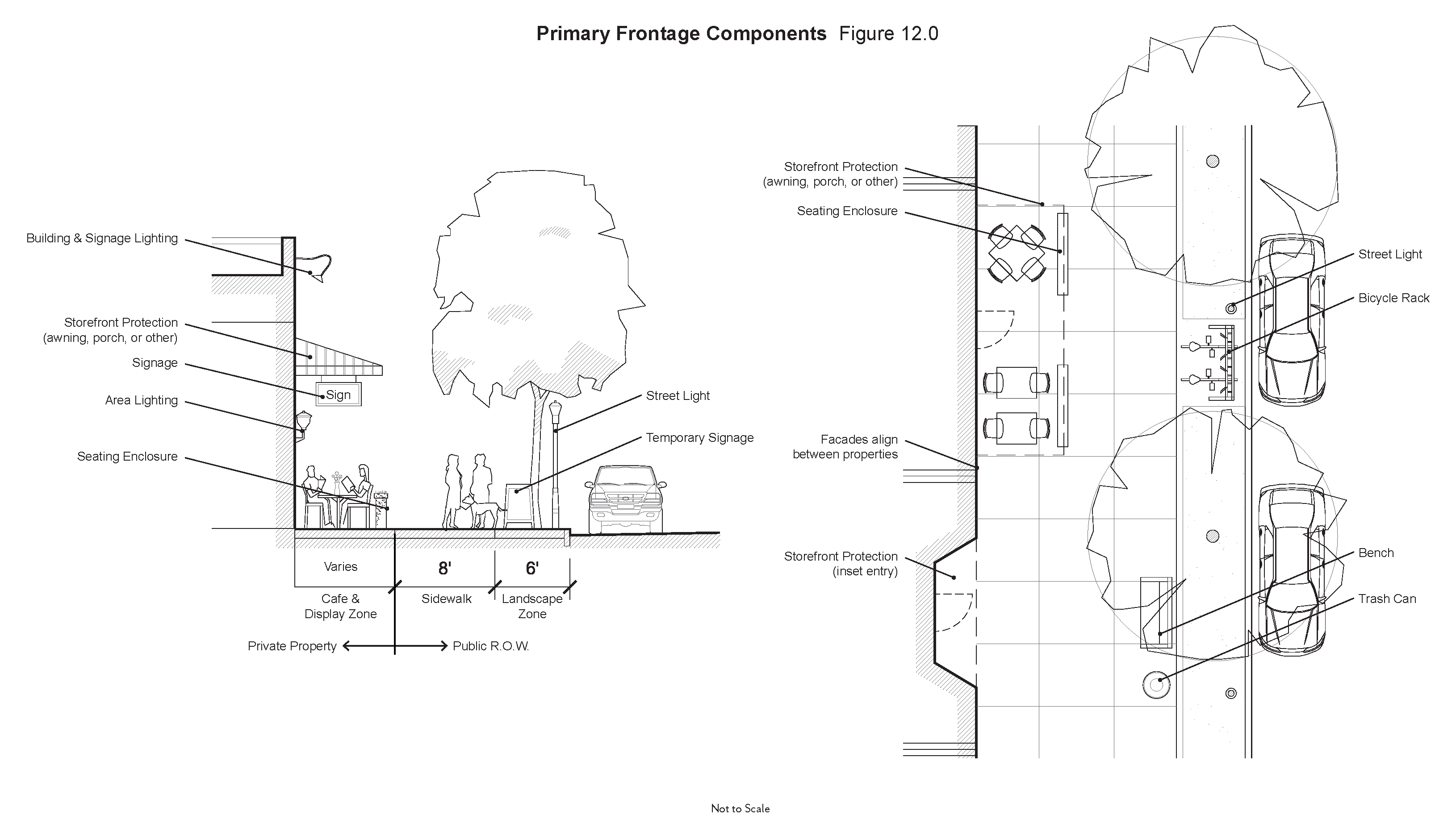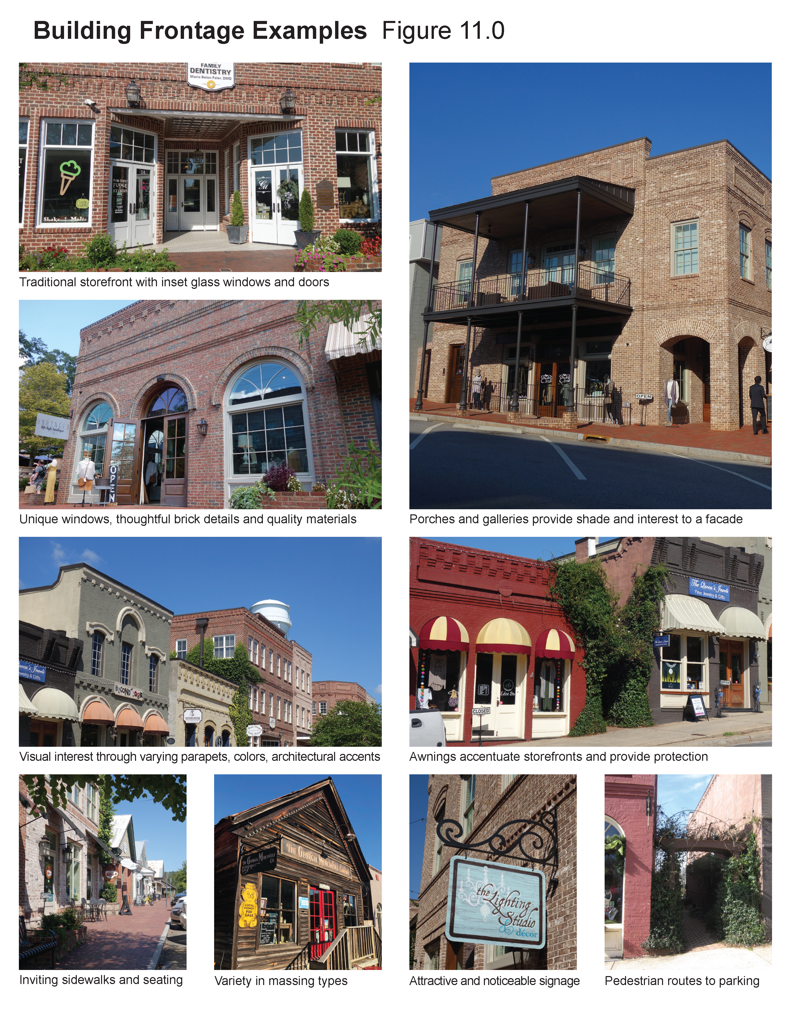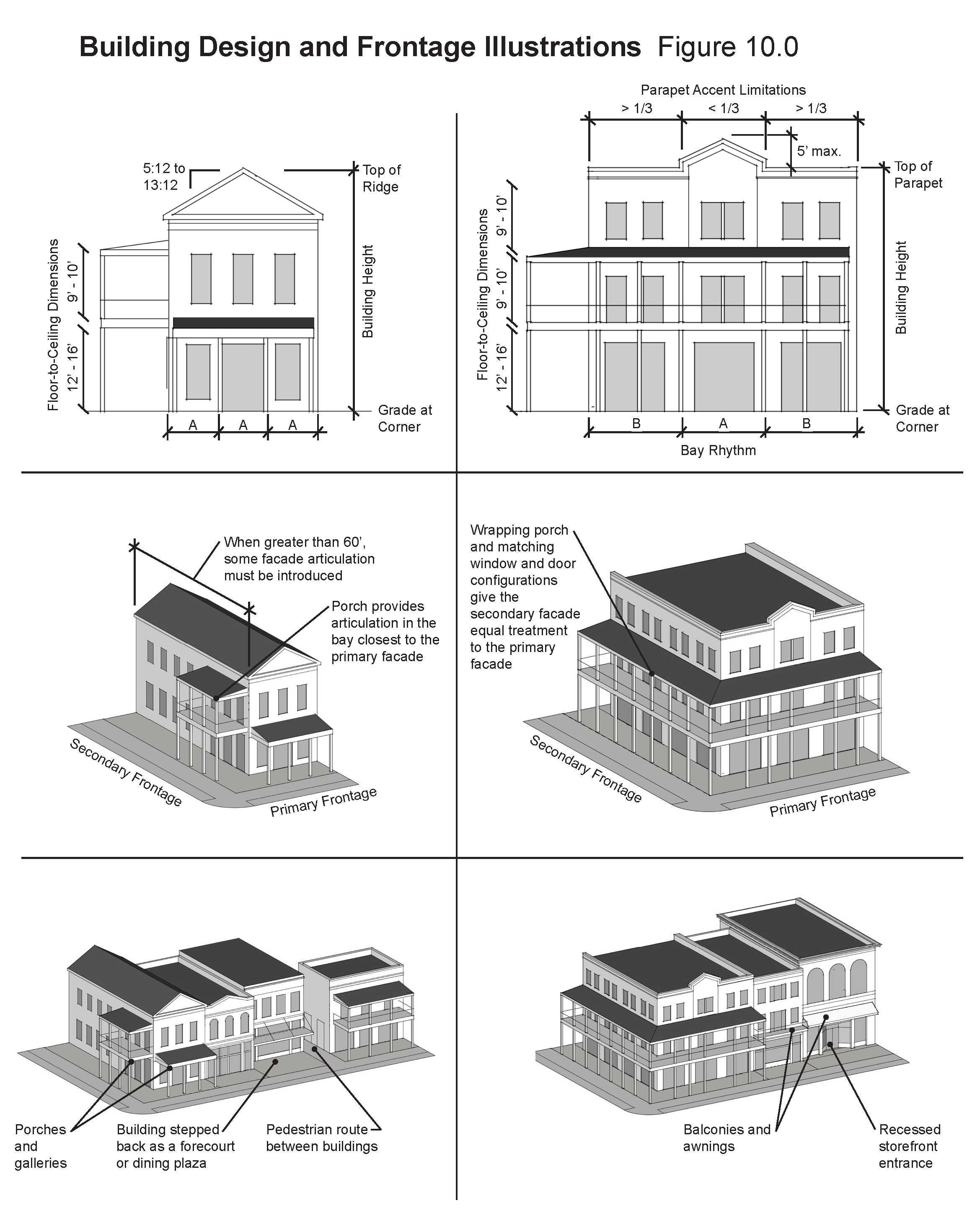 The purpose of this section is to regulate the street-front buildings envisioned for the district in order to provide an appropriately scaled and designed pedestrian environment reflective of the historic town center. See Building Design and Design Illustrations Figure 10.0 for reference on the following items.
