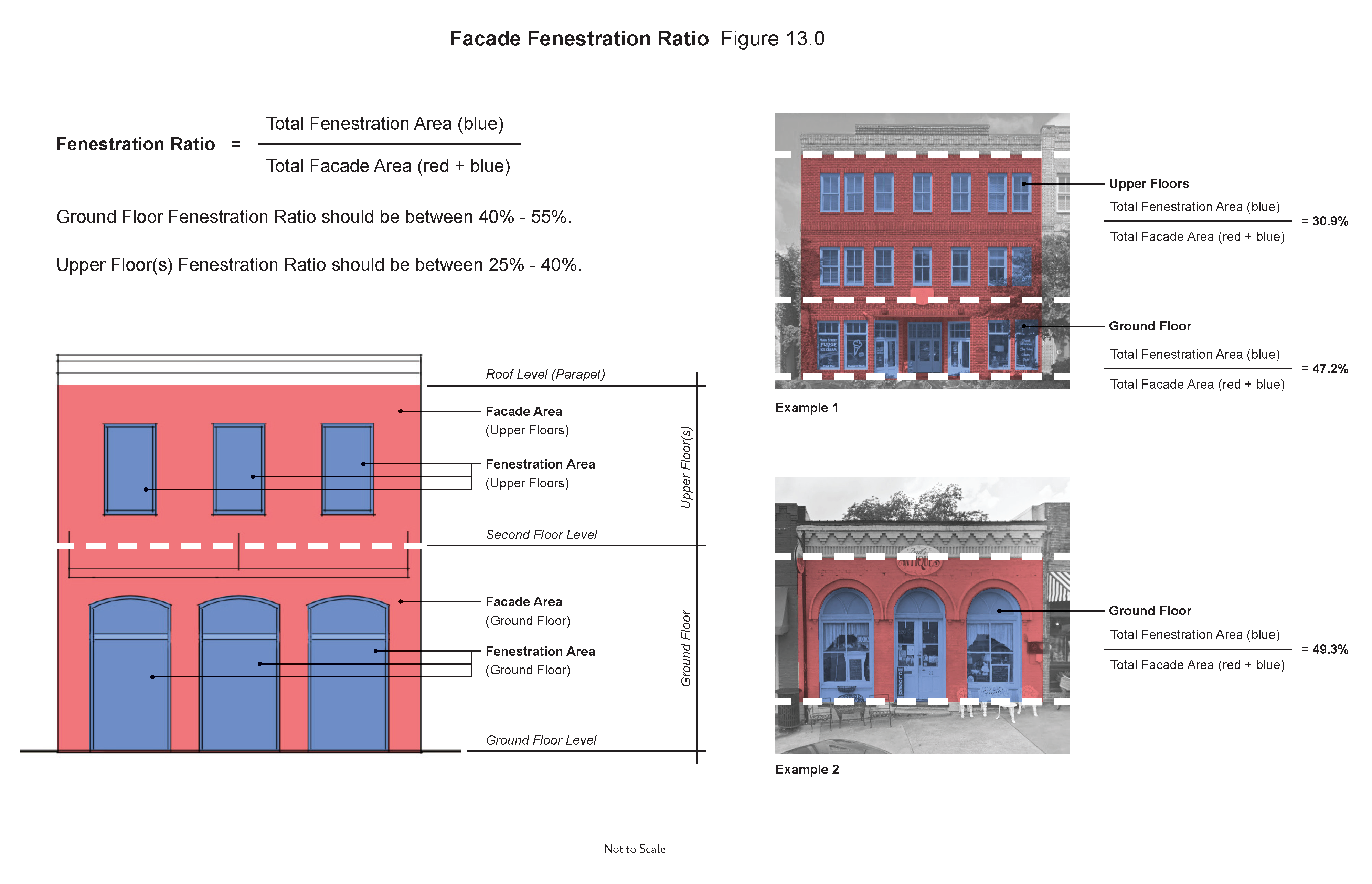 Fenestration ratio. The punctuation (door and window openings) in a building's façade is referred to as its fenestration. Two important factors of regulating fenestration are: 1) to ensure an appropriate ratio of openings to wall surface for a building façade, and 2) to ensure a degree of transparency or visual connection between the outside and inside. When calculating the fenestration area, door and window units including frames and trim may be included, however any recess or panel that does not also have a degree of transparency may not be counted. Doors that do not include glass or windows that may have opaque glass or other view-obscuring elements may only contribute up to five percent of the fenestration ratio for that floor level and also fenestration ratio figure 13.0.