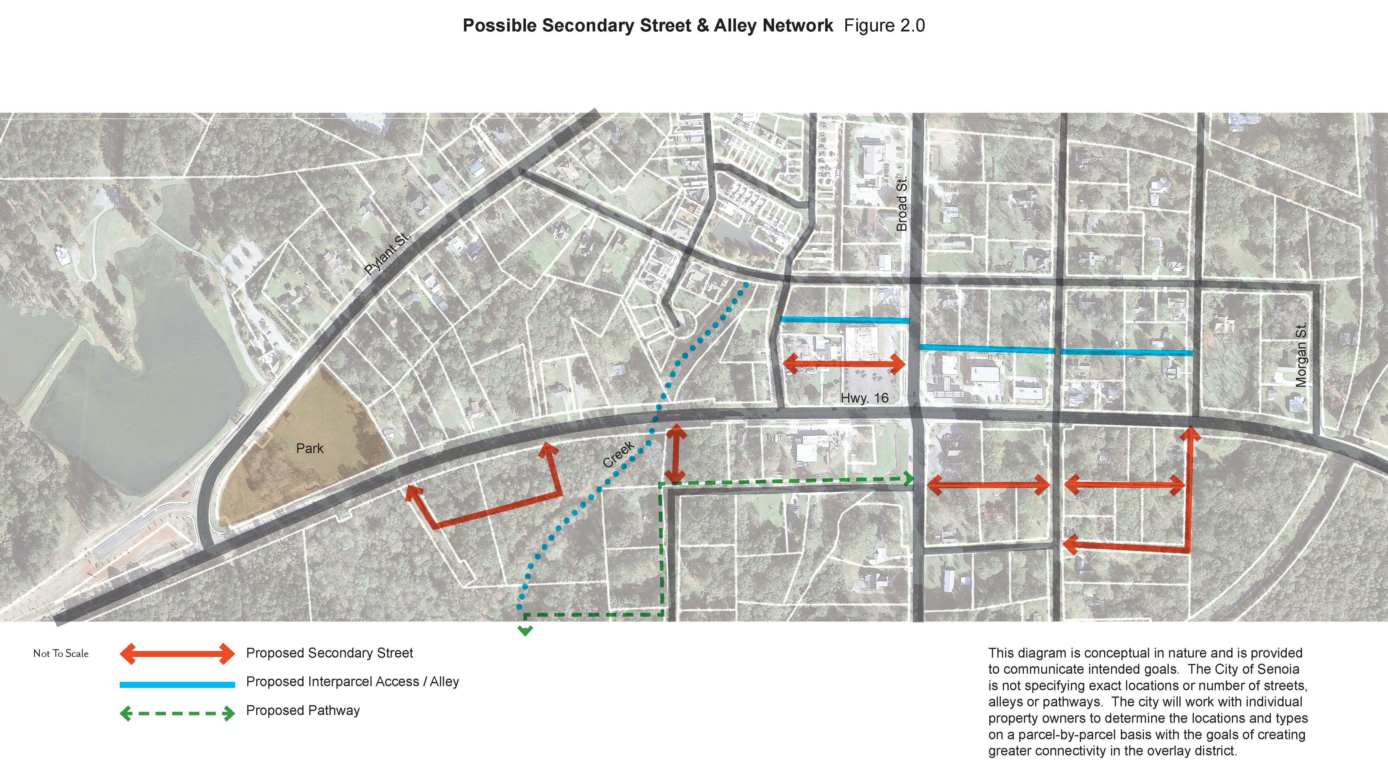 A "secondary street network" is intended to minimize disruption of traffic flow on Highway 16 by providing new, alternative routes. Platting of properties being developed within the overlay shall afford construction and dedication of such a network either through provision of building sites accessed from secondary street or by platting of building sites along Highway 16. See Possible Secondary Street and Alley Network Figure 2.0.