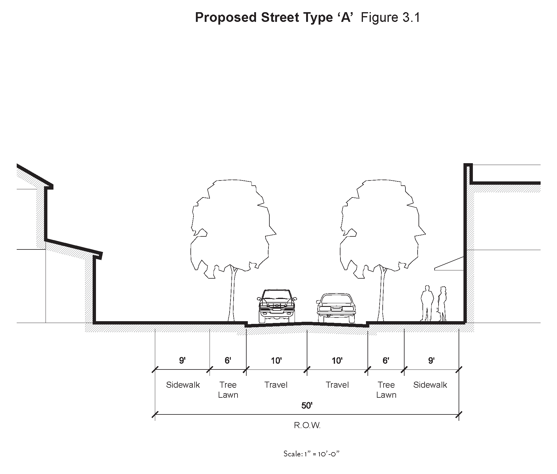 It is required that each site plan submitted for any development within the overlay provides for present or future dedication of right-of-way as previous platting may accommodate for construction of public streets. Such streets shall provide access to property interior to the development. Approval of any site plan for development along the proposed secondary street shall be conditioned upon agreement of the developer of the property to fully fund the cost of construction of such proposed public street along that development's frontage. The site plan shall consider the alignment of such secondary street on adjacent parcels and shall cooperate with the city in the design and layout of an efficient and economical secondary street network and a minimum of a 50-foot right-of-way to be established on the property. See Street Sections Figures 3.1, 3.2, 3.3, 3.4.
