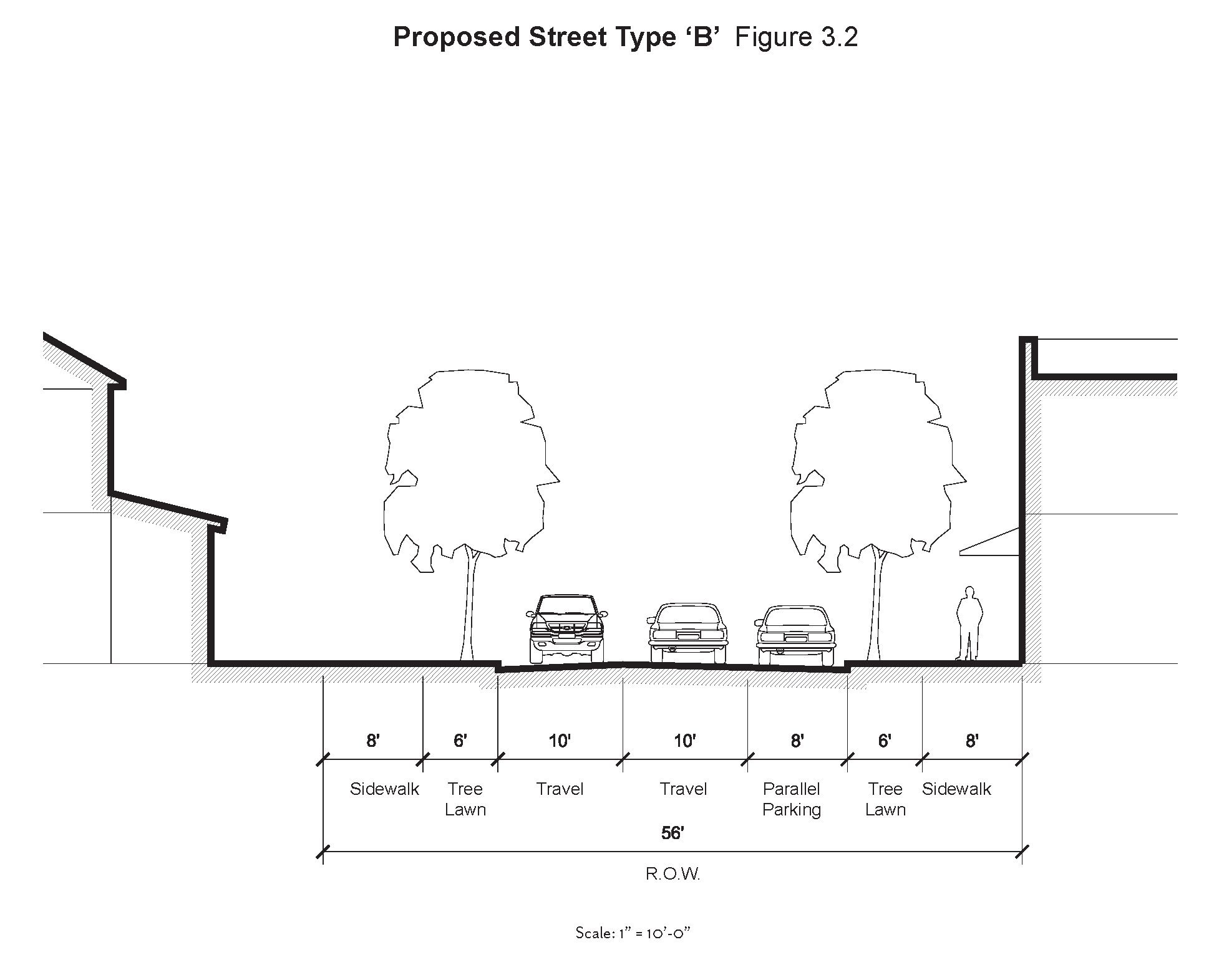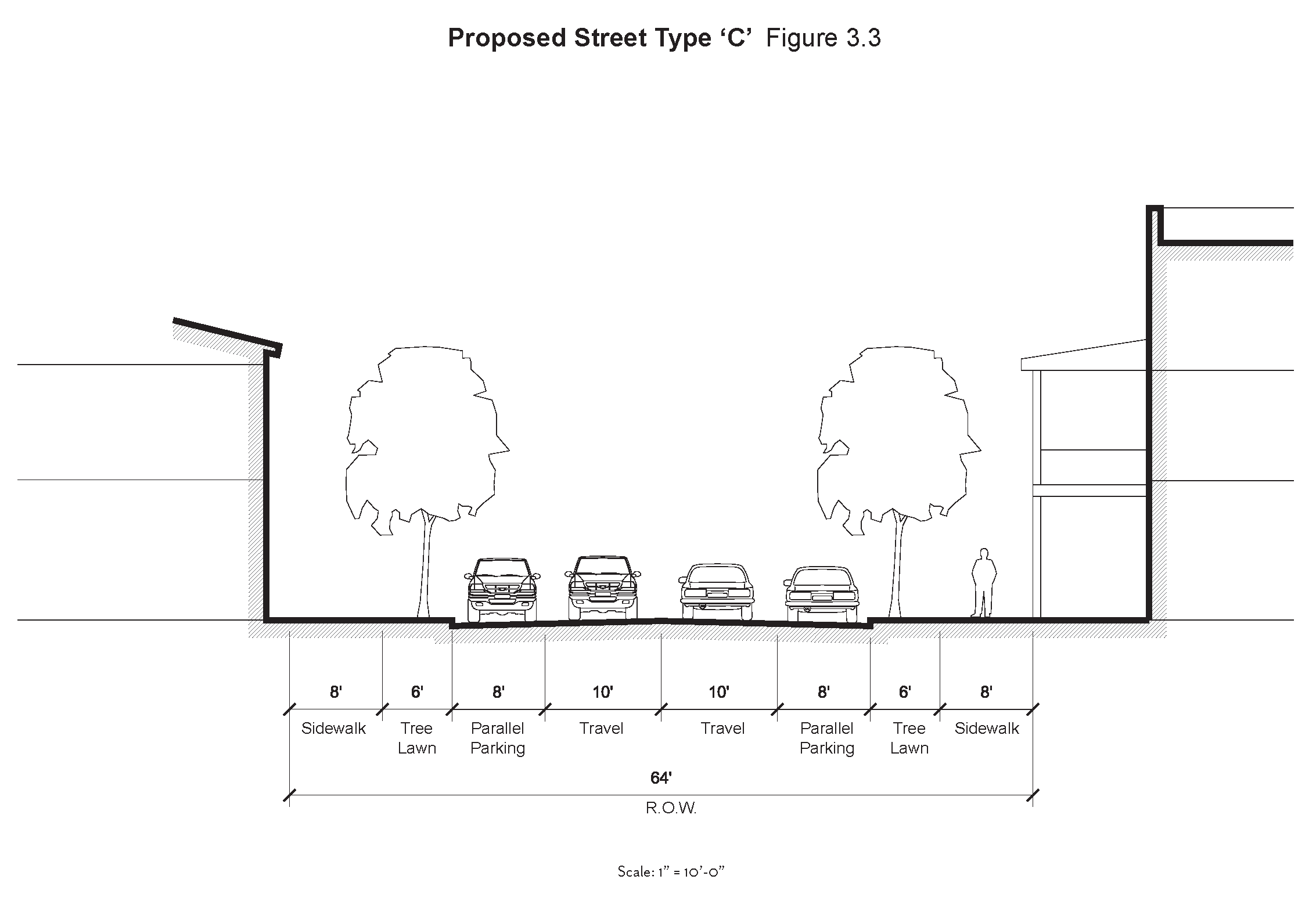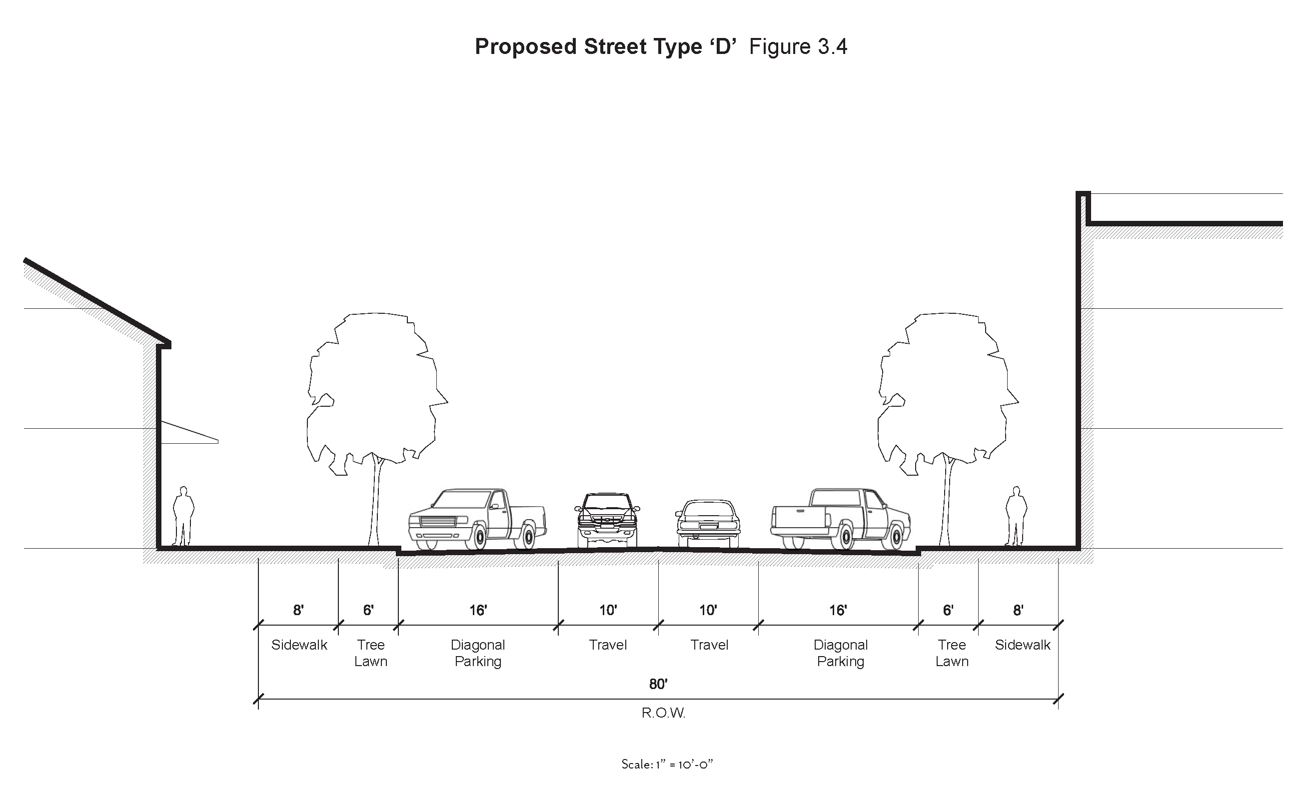 On-street parking may be incorporated into existing streets or proposed secondary streets as determined by the city. See Street Sections Figure 3.2, 3.3, 3.4 for possible configurations of parking. The city reserves the right whether to allow on-street parking to count towards an abutting parcels parking needs.