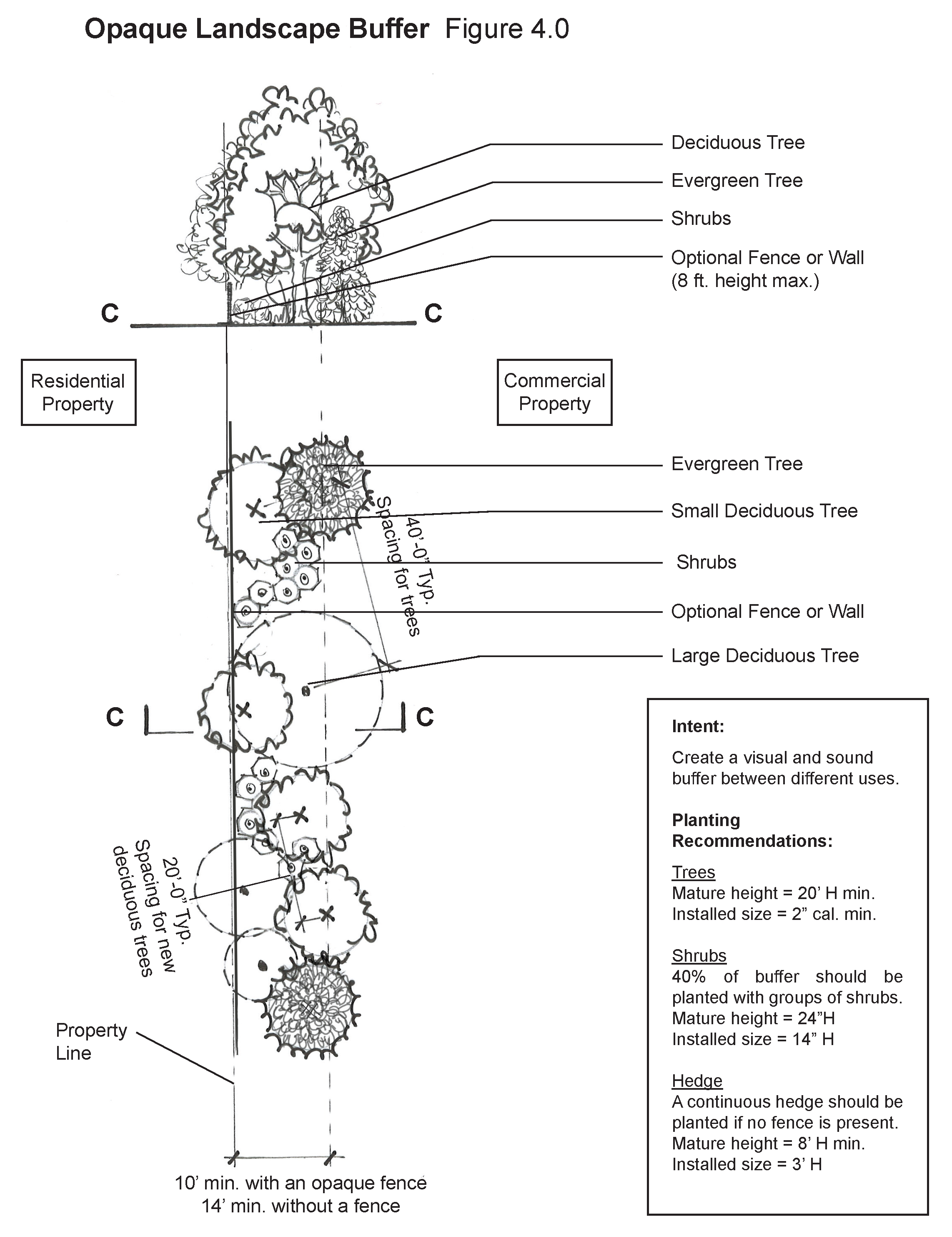A landscape buffer having a minimum horizontal dimension of 15 feet shall be provided along property lines abutting residential uses. In the case that a fence or wall of six feet min. and eight feet max. is incorporated, the horizontal dimension can be reduced to ten feet but must still incorporate landscape plantings. See Opaque Landscape Buffer Figure 4.0.