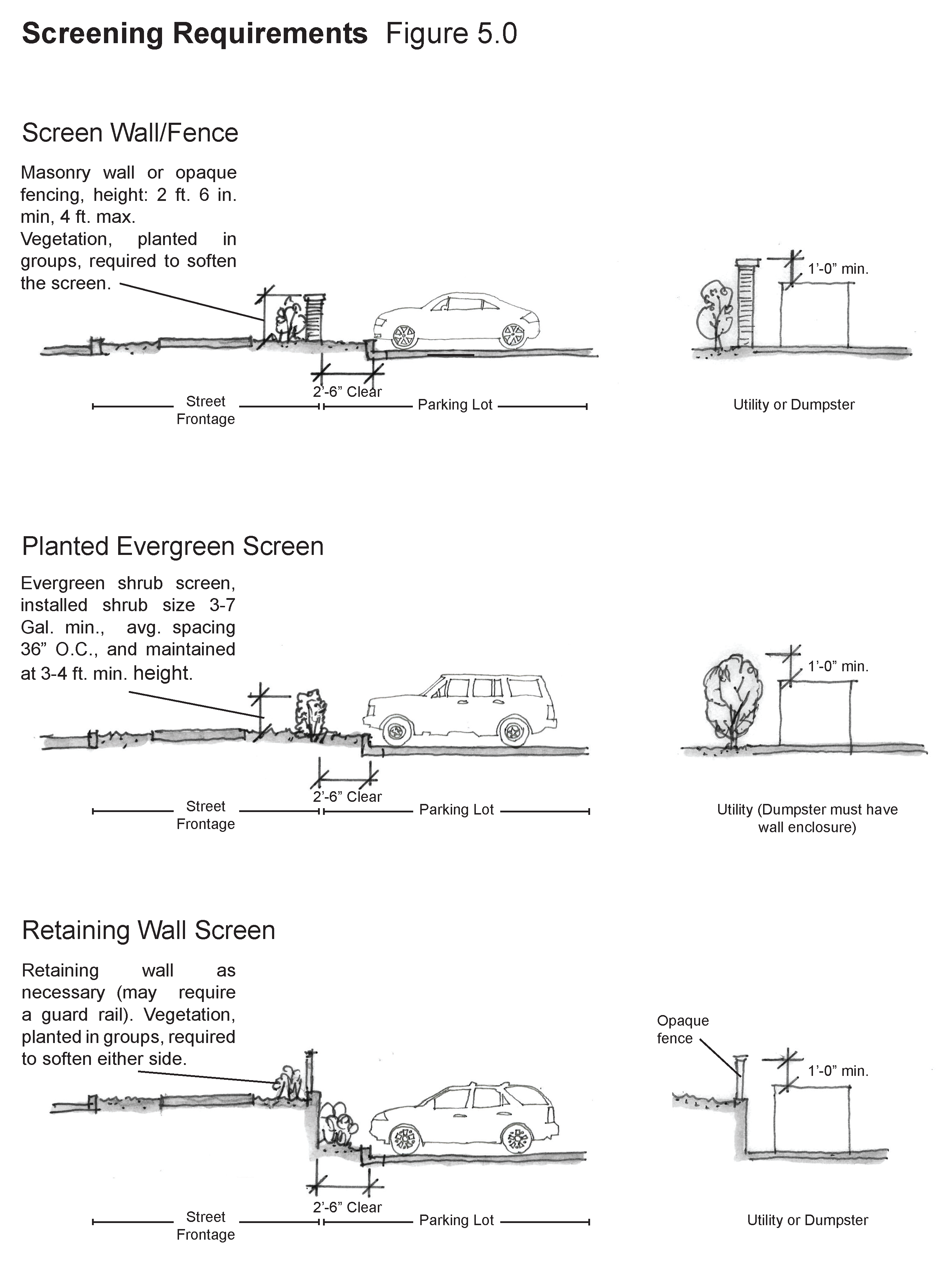 Screening elements. All developments shall, to the extent practical, provide screening elements for the purpose of shielding unattractive utilities, dumpsters, loading docks, parking areas, and similar areas from view from the street or neighboring properties. See Screening Requirements Figure 5.0.