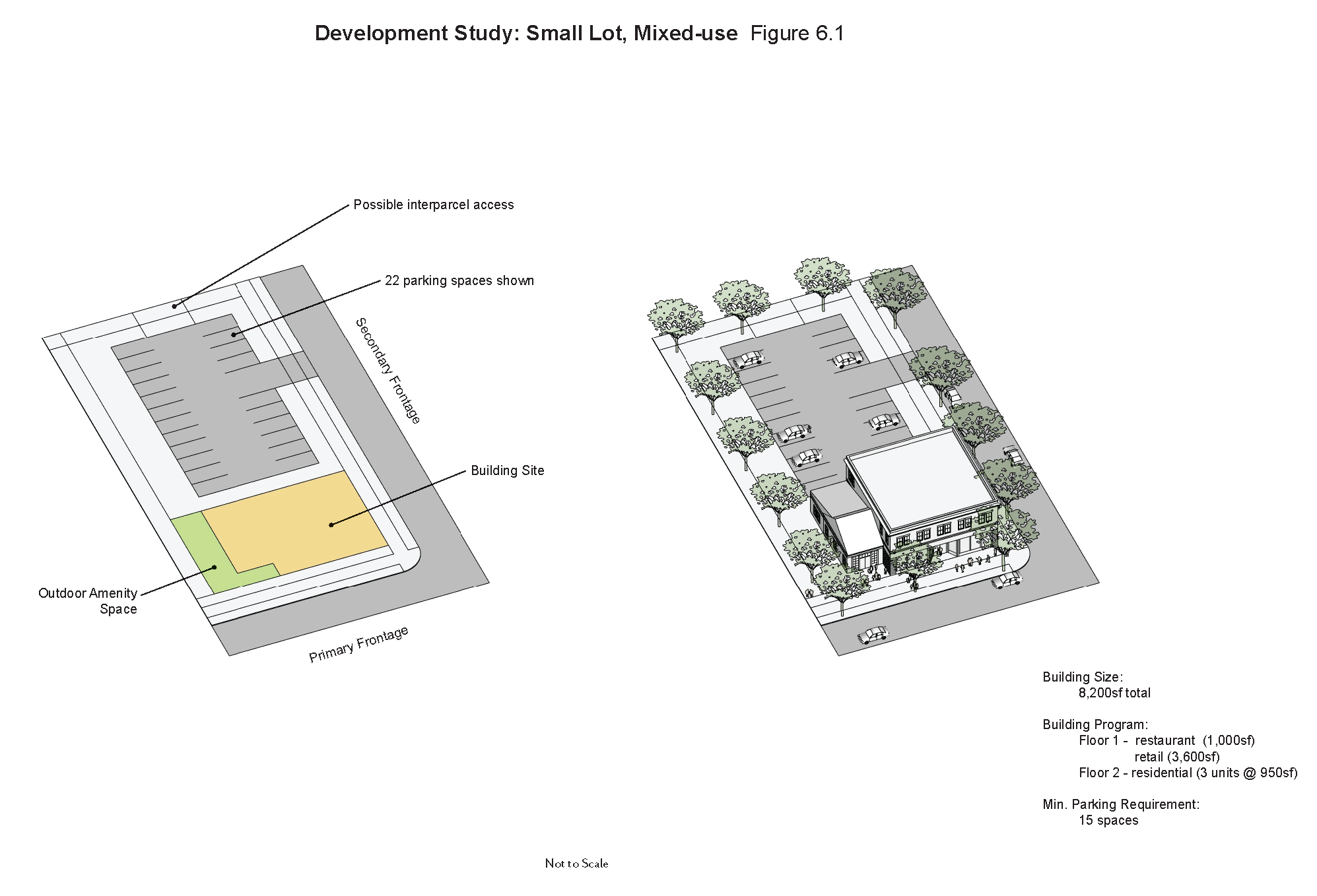 Example site designs of different development scales and programs illustrate points below. See Development Study Figures 6.1, 6.2, 6.3.