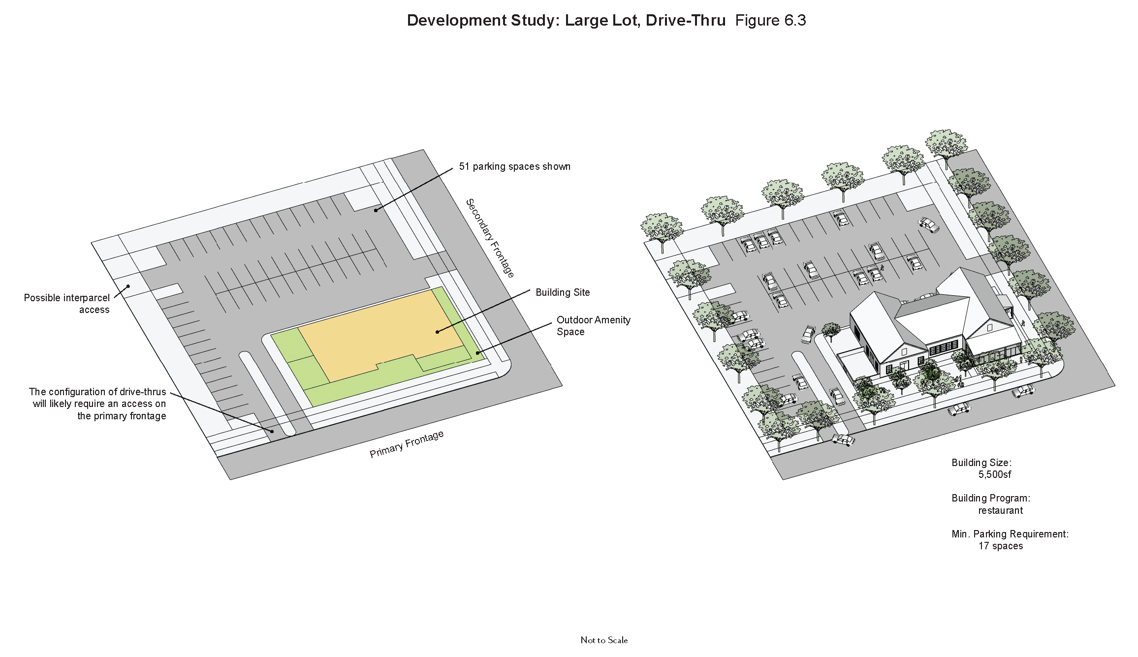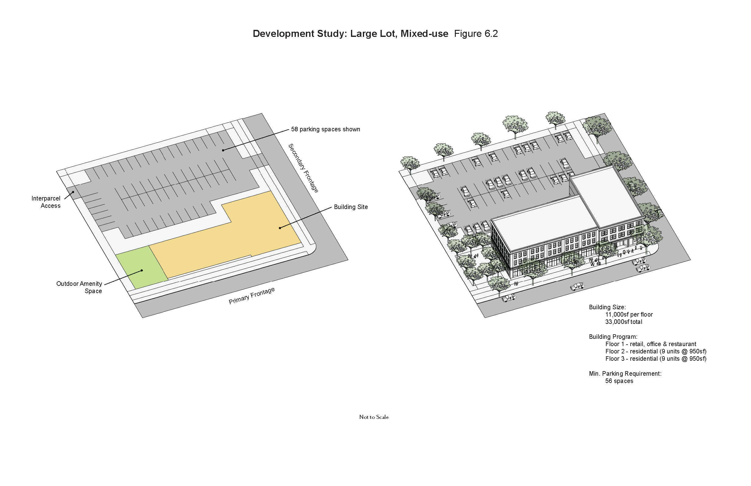 Off-street parking shall be uniformly distributed across the rear of the building, and allow access to adjacent lots. No off-street parking should be located between the building and the primary frontage.