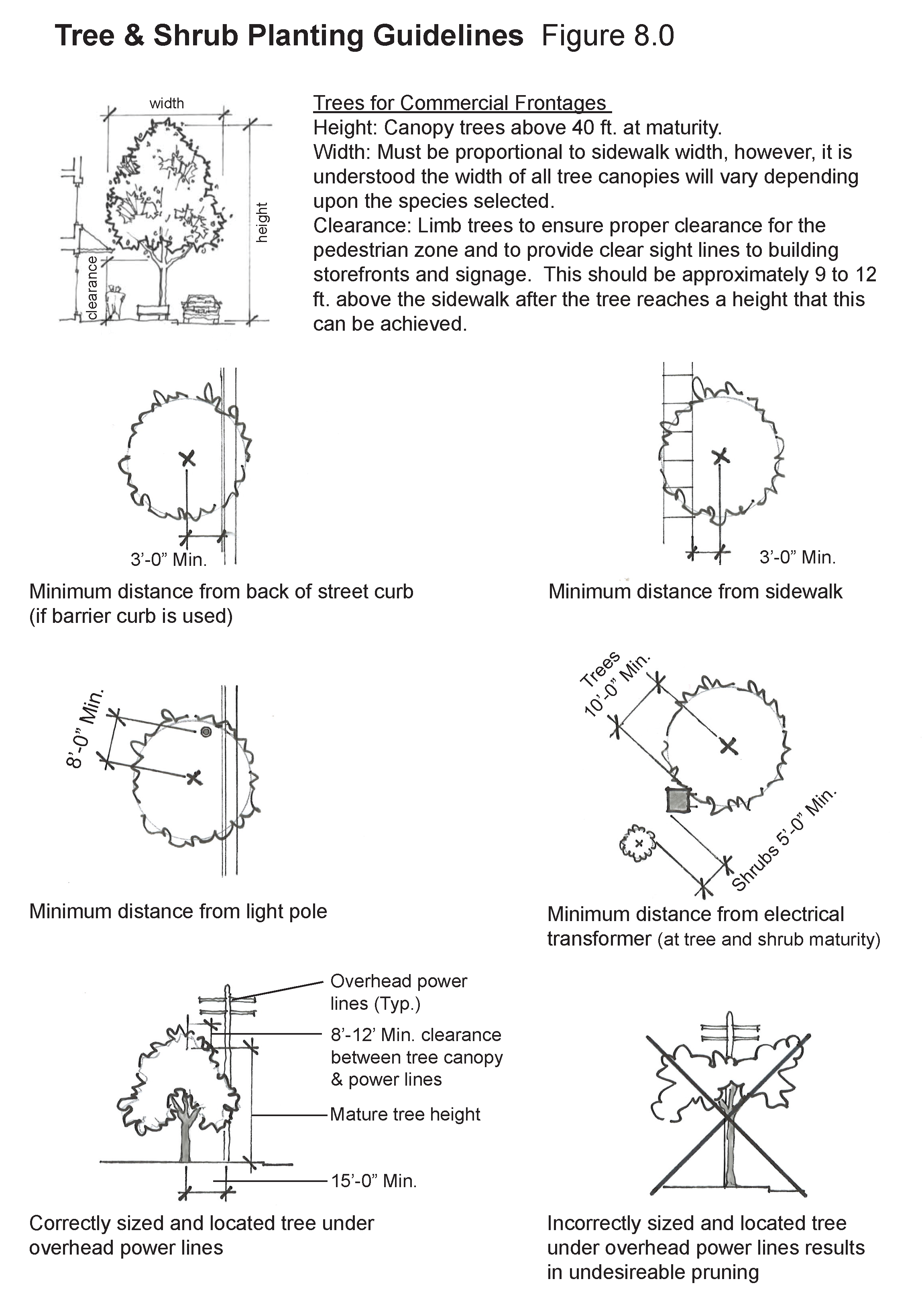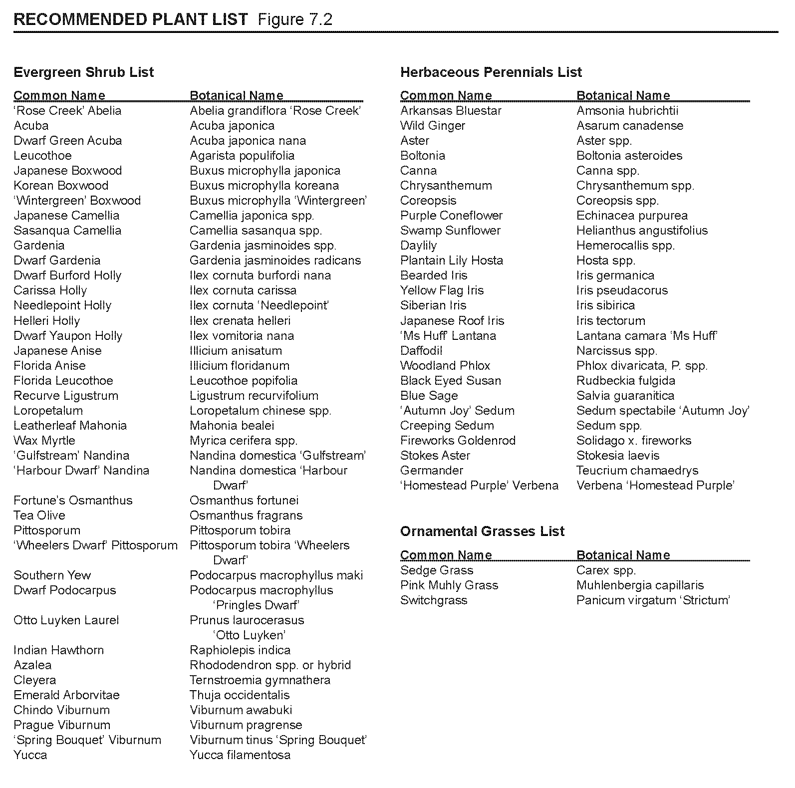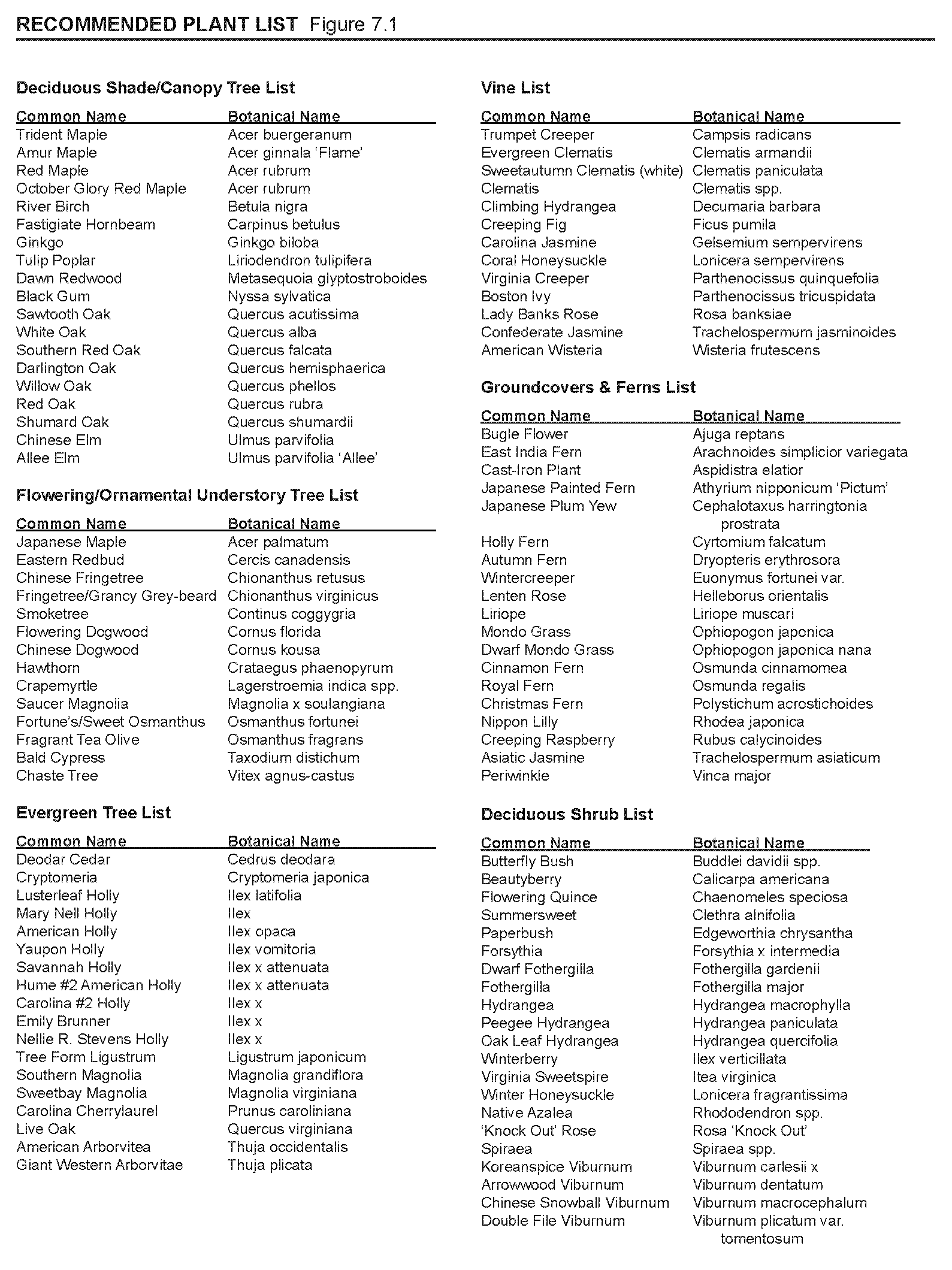 A planting plan is expected to be submitted with the site plan during the approval process. To assist applicants in this, a list of recommended trees, shrubs, vines, ground covers, perennials and grasses has been compiled for the applicant's convenience and consideration. See Recommended Plant List 7.0.