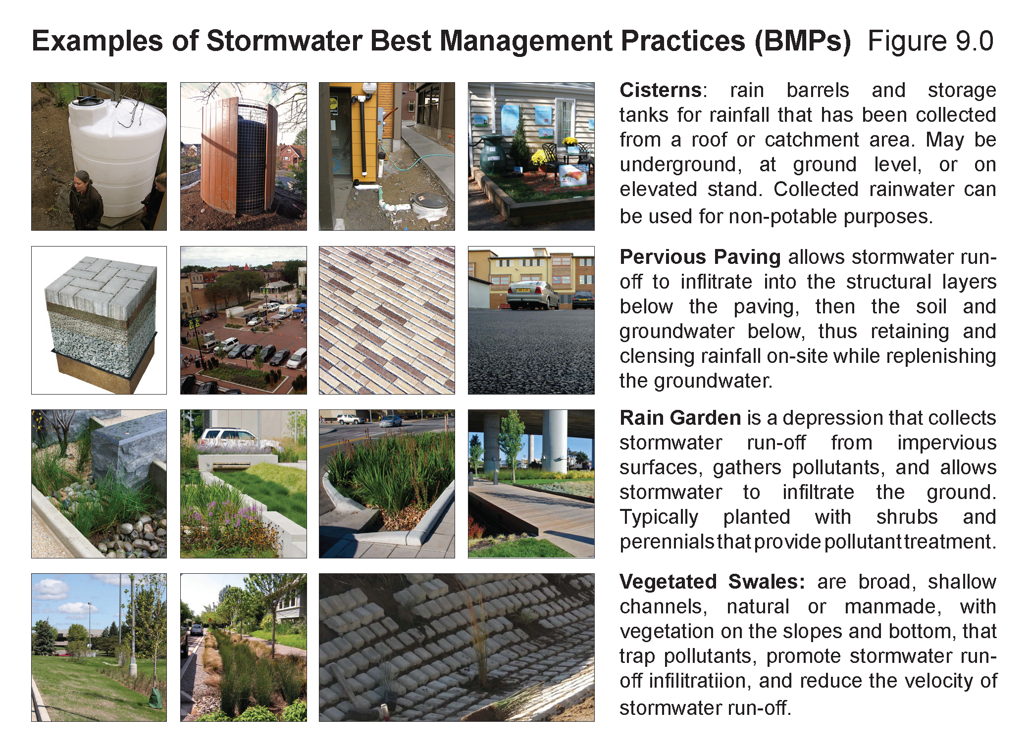 Stormwater management. The purpose of this section is to establish the following objectives for landscaped areas and buffers: limited stormwater runoff from development sites, minimize erosion, establish measurements for water conservation, and reduce the adverse environmental effects of impervious paving areas. These strategies can be naturalistic as well as urban in form and character. Ideally, a variety of stormwater best management practices (proven sustainable stormwater treatment strategies), each with a different visual appearance, are integrated into the new development site plans in order to capture and cleanse stormwater runoff. See Examples of Stormwater Best Management Practices (BMPs) Figure 9.0.