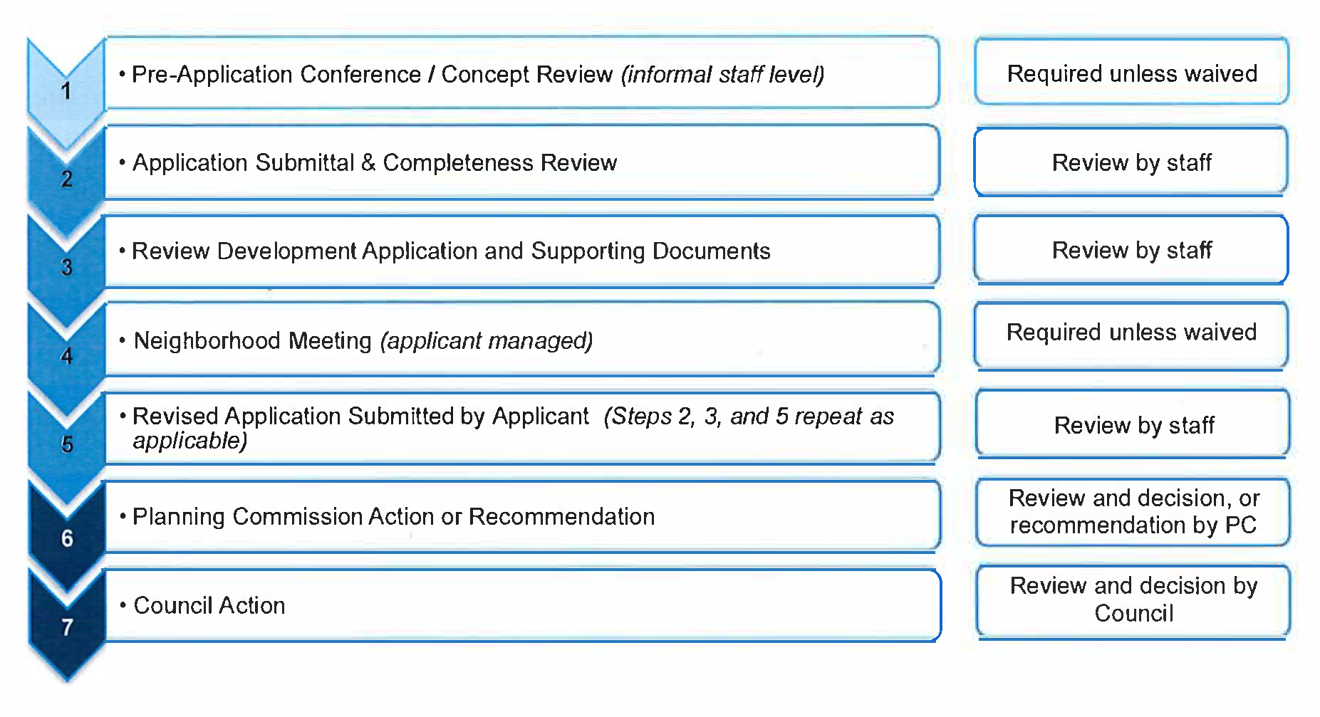 Step 5: Applicant Resubmits Revised Plans and Supporting Documents. Following the initial review by the Town and referral agencies and completion of a neighborhood meeting, as applicable, the applicant is responsible for resubmitting revised plans and supporting documents that address comments received by the Town and referral agencies. If the applicant chooses not to address any specific comment(s) or recommended change(s), a written explanation shall be included with the resubmittal that demonstrates a good faith effort to address the issue or justify why the comment was not addressed. Failure to address any comment or recommended change without explanation may be grounds for rejection of the revised application resubmittal. Steps 2, 3, and 5 repeat until the application is deemed ready for the next step in the process by the Manager.