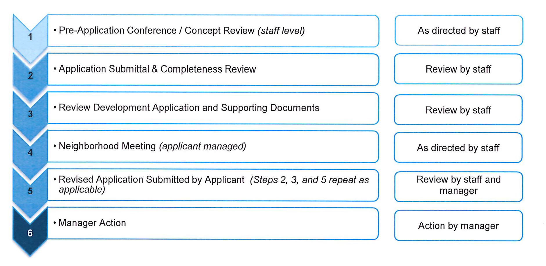 Step 6 (administrative): Manager Action. For administrative applications, after consideration of the development application, the staff comments, comments received from other reviewers (if applicable), the Town Manager shall approve, approve with conditions, or deny the application based on its' compliance with the applicable approval criteria.