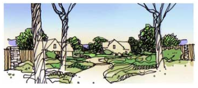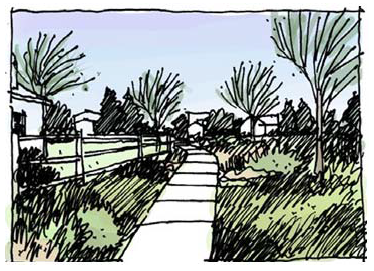 The perimeter treatment adjacent to major roadways should include a landscape buffer of varying width with a minimum width of twenty (20) feet. A developer-installed fence should be placed inside the property line within an easement on each lot or tract. The landscape should be complementary to the rural character of the surrounding area. The use of shade trees is encouraged along greenbelt community pathways.