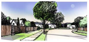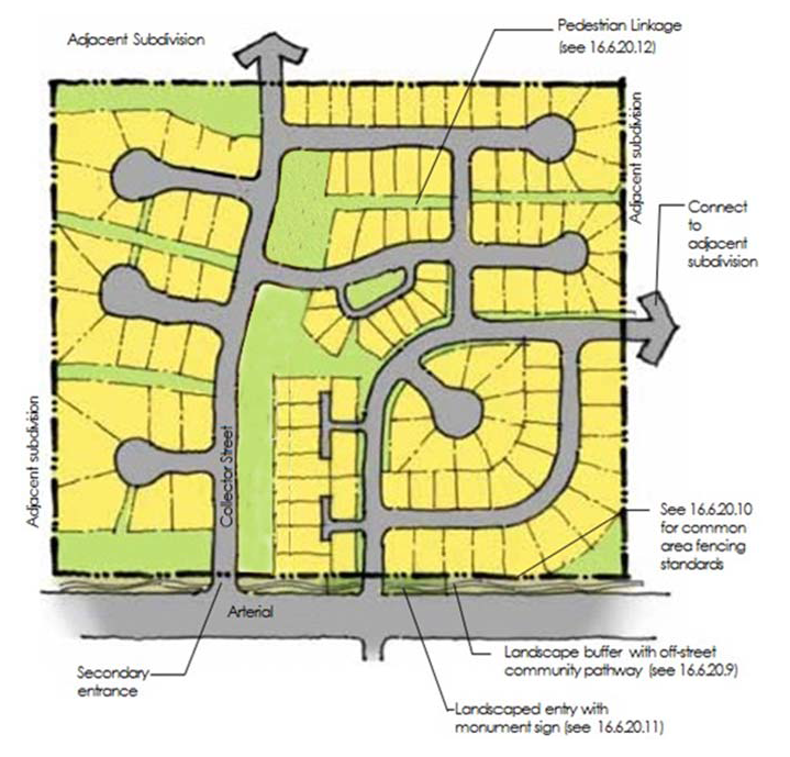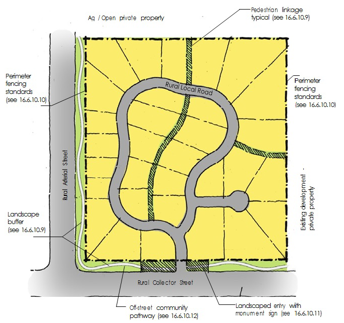 Typical subdivision layout. Subdivisions in the rural residential area shall be designed with an internal rural roadway system to serve lots within the subdivision. Each lot shall have frontage onto a roadway. The perimeters adjacent to major roadways shall be landscaped and shall provide pathways for pedestrian linkages. Fencing shall be open and visually interesting along the perimeter street frontage. The main entrance to the subdivision will typically have a monument sign and landscaping. Open space and drainage corridors within the subdivision will provide opportunities for pedestrian linkage to adjacent subdivisions. Each subdivision proposal should reflect the Comprehensive Plan.
