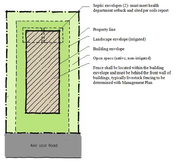 Typical single-family lot layout. The vision for a typical single-family lot is to create a buildable area and identify septic envelopes and open/landscape areas. Just outside of the building envelope is a landscape envelope, intended to be Planted with irrigated turf and Plantings. The area between the landscape envelope and the property line consists of native, non-irrigated landscaping in order to create a feeling of openness and uniformity between lots. Fencing shall be reviewed and approved by the HOA/Metro District and the Town.