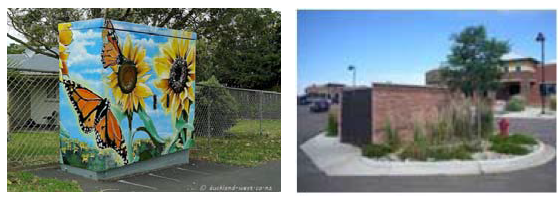 Buildings that back to the public right-of-way, parking lots, utility pedestals and trash enclosures shall be buffered with landscaping. Trash enclosures shall be located in places that have the least impact on views from the public right-of-way, as practical. Trash enclosures shall be masonry with steel gates to match building architecture.