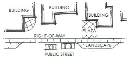 In areas where the right-of-way is narrow, on-street parking, a variety of building setbacks and building edges articulated toward the street are encouraged.