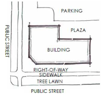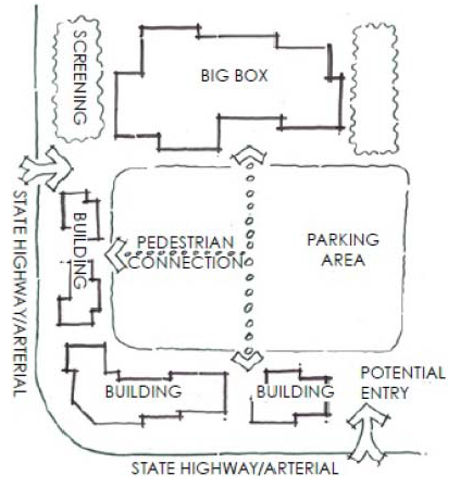 In areas where a state highway or arterial street is not present, buildings shall be oriented toward the public right-of-way to keep parking lots behind the buildings.