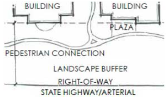 Where property abuts a state highway or arterial street, large landscape buffers are required. Delivery areas and trash enclosures shall be screened from the public right-of-way.