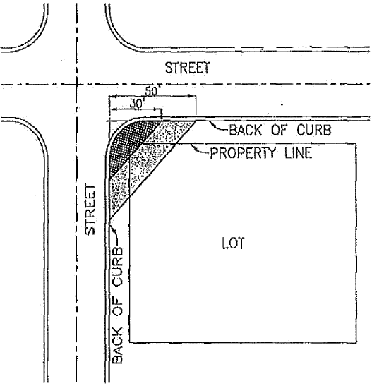 | Key: A = 100 feet by 100 feet sight triangle B = 50 feet by 50 feet sight triangle for lots receiving preliminary plat approval after March 26, 2009 B = 30 feet by 30 feet sight triangle for lots receiving preliminary plat approval prior to March 26, 2009 | ||||