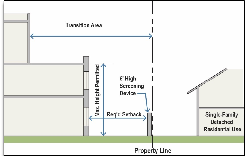 Residential transition standards. In the Edge and Transition Subdistricts, residential transition standards apply to all new building construction and all upper-story additions to existing buildings located adjacent to existing single-family detached residence but shall not apply when an improved public street or railroad right-of-way separates the new building construction from the existing single-family detached residence (See Table II.10: Residential Transition Standards).