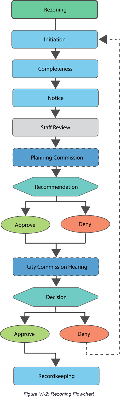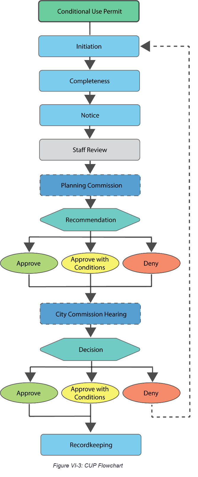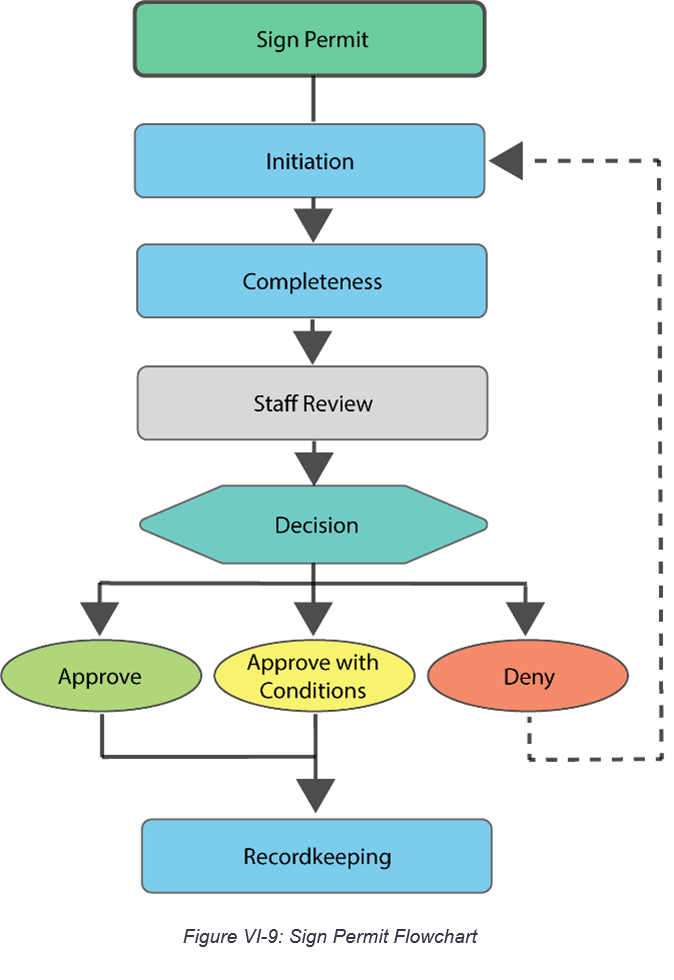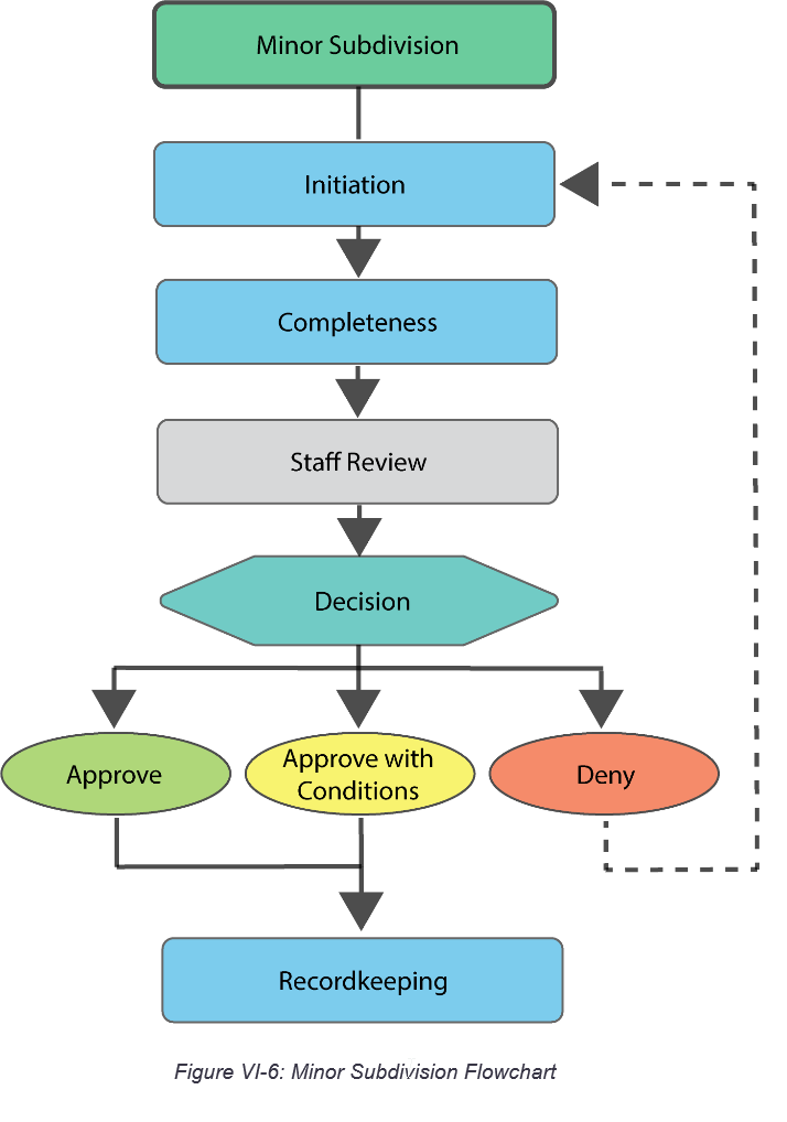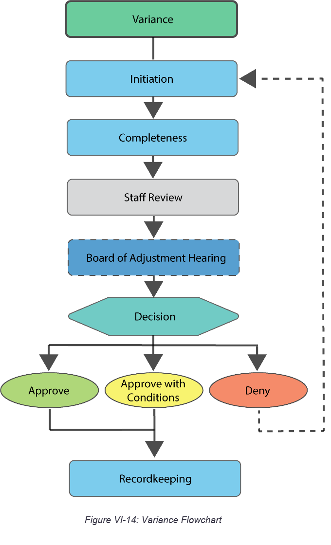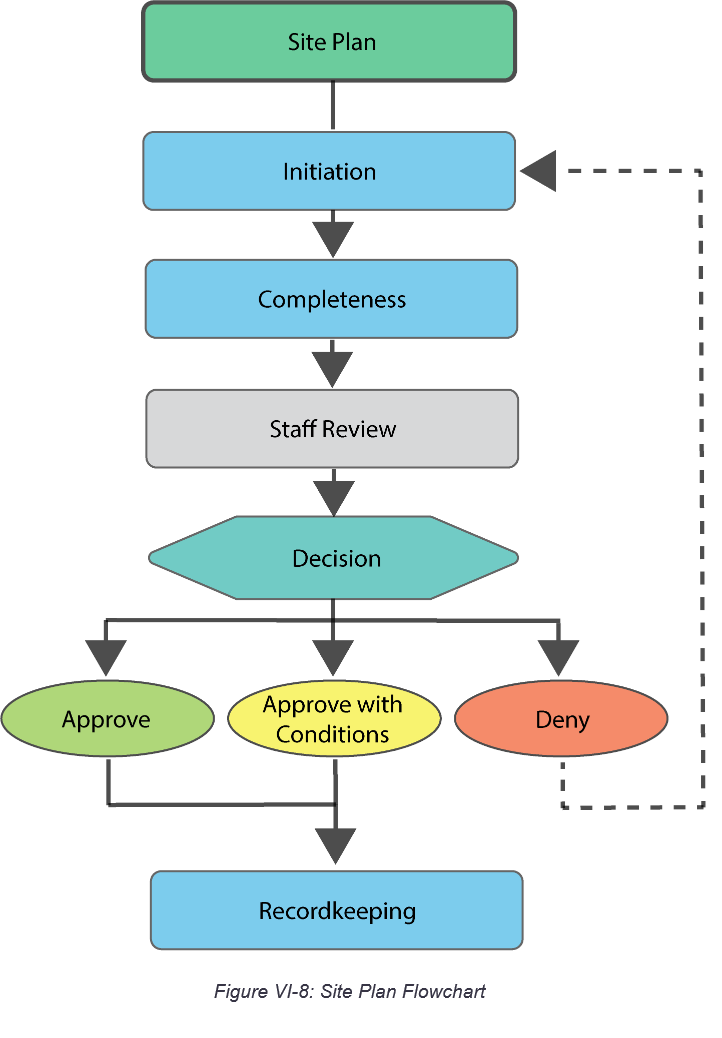 Procedures. This section sets up rules for procedures, such as notices and public hearings. It then describes the process for specific land use decisions. The procedures have a common workflow and description per Table VI.1: Procedural Components.
