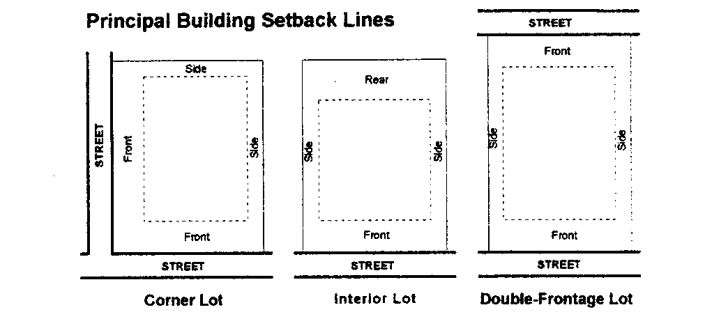Setback, minimum, means the shortest distance allowed between a street right-of-way line or any other lot line and any principal or accessory building on a lot. Minimum setback requirements for buildings are associated with the type of lot line from which the setback is taken; for instance, a side yard setback is measured from a side lot line.