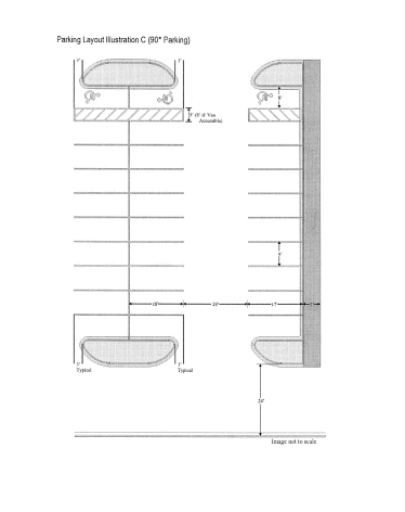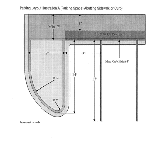 Sidewalk width adjacent to parking spaces (typically seven feet minimum)