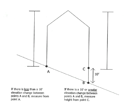 Grade means either of the following: (a) the elevation of the highest adjoining sidewalk or ground surface within a five-foot horizontal distance of the exterior wall of the building when such sidewalk or ground is not more than ten feet above the lowest grade of the lot; or (b) an elevation ten feet higher than the lowest grade when the sidewalk or ground surface is more than ten feet above lowest grade.
