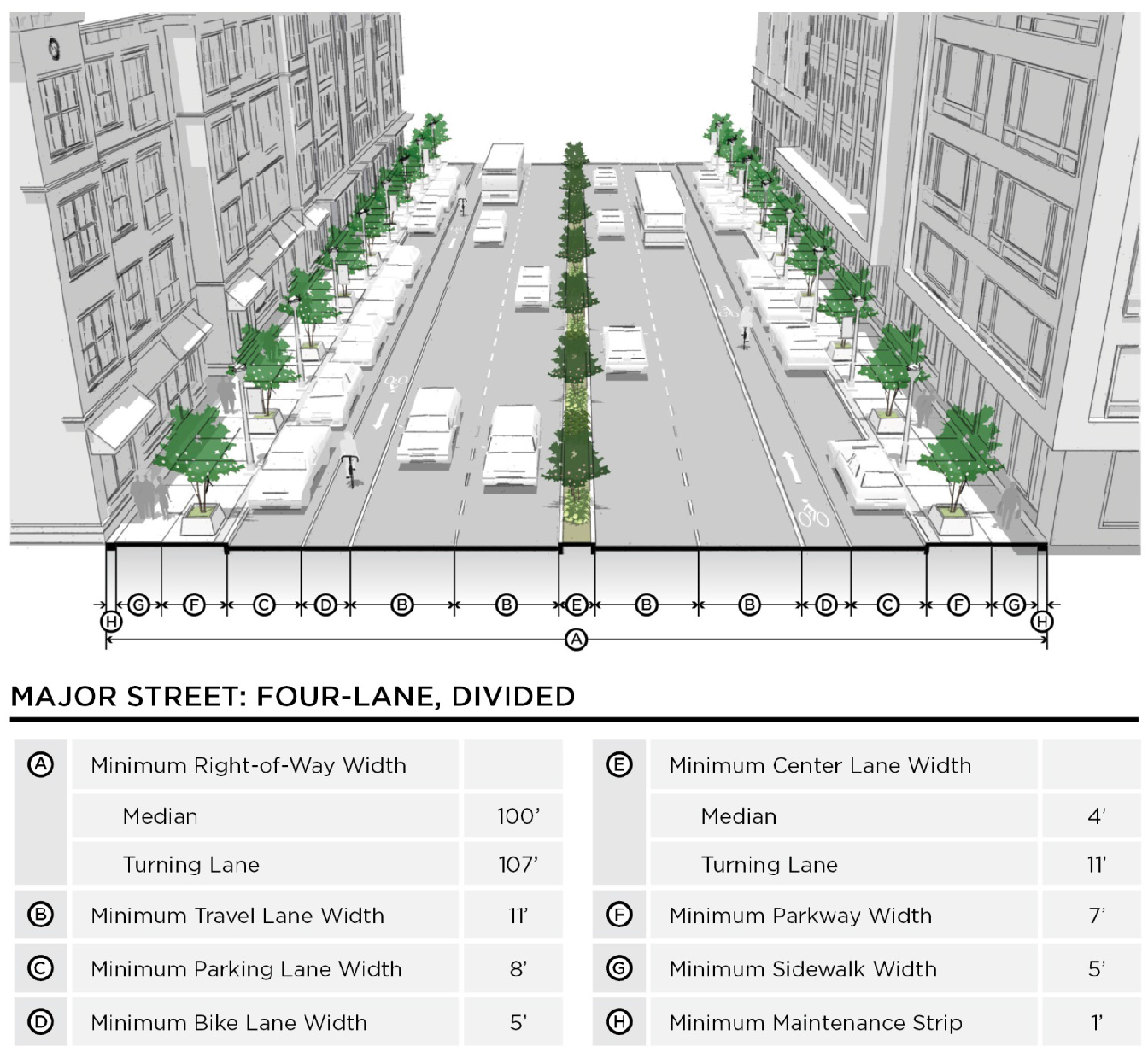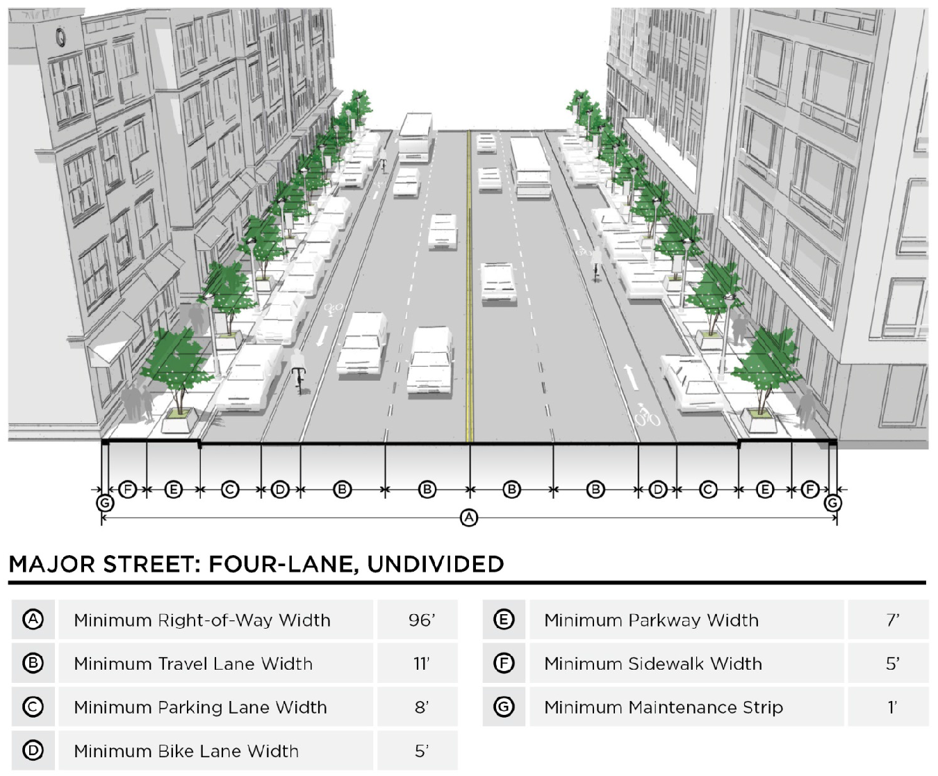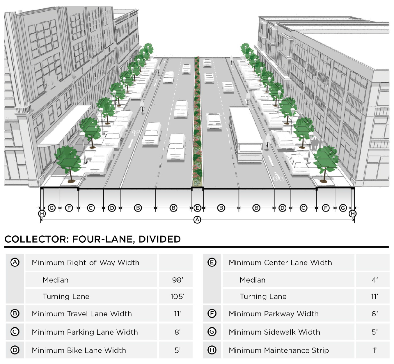 Minimum dimensions are provided for each right-of-way type. The illustrative examples are also provided to illustrate a potential configuration of a right-of-way type. Variations to these configurations may be approved by the City Engineer and the Director of Water and Sewerage. All dimensions indicated are minimums, unless otherwise noted.