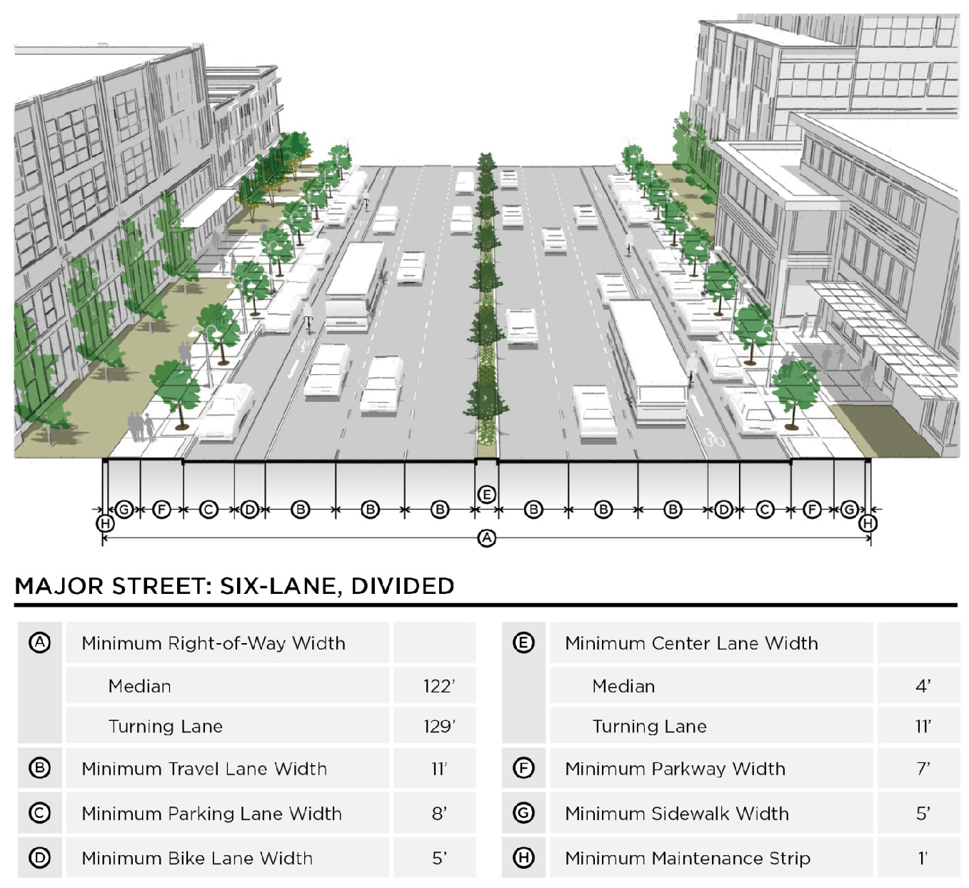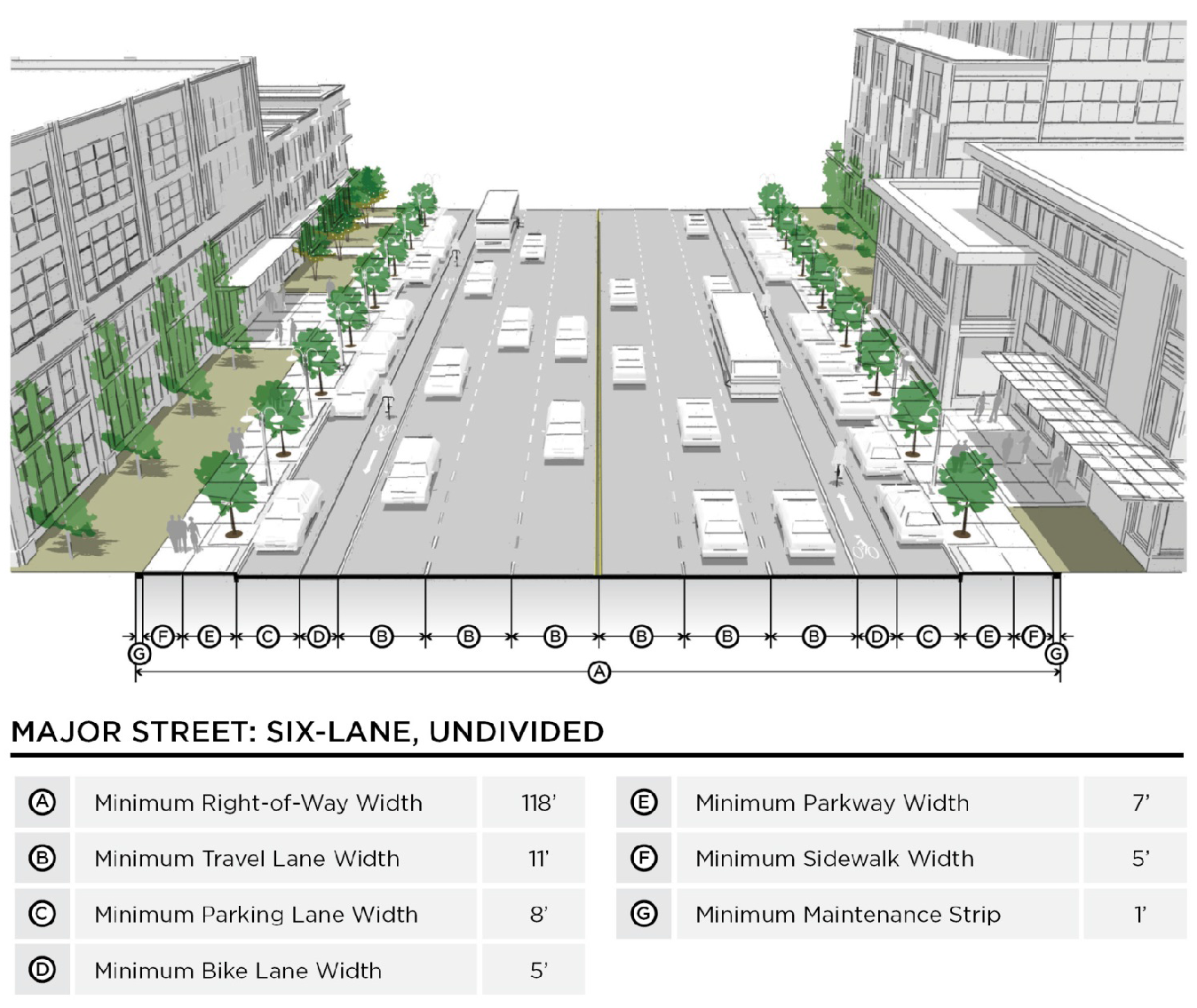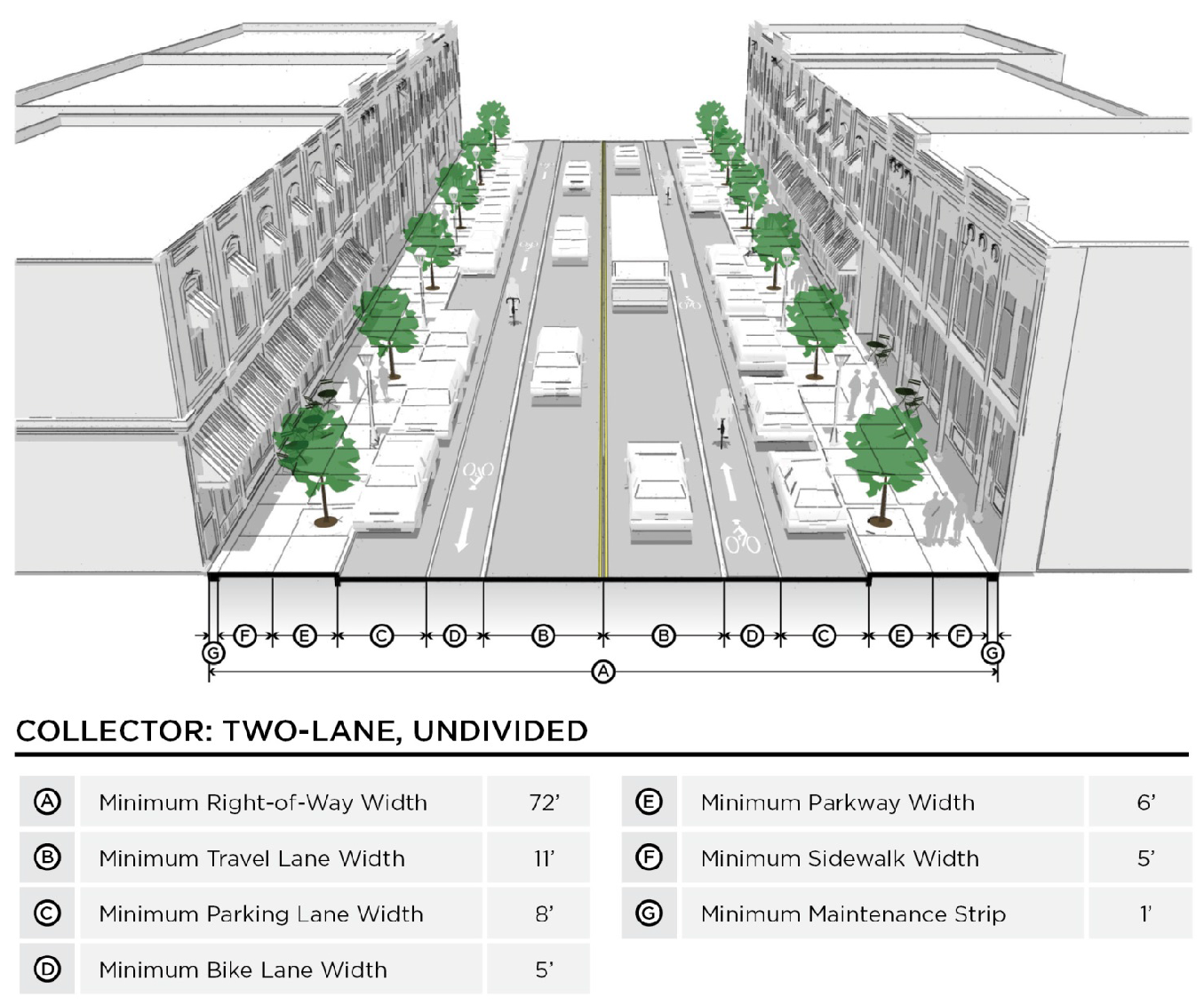 Minimum dimensions are provided for each right-of-way type. The illustrative examples are also provided to illustrate a potential configuration of a right-of-way type. Variations to these configurations may be approved by the City Engineer and the Director of Water and Sewerage. All dimensions indicated are minimums, unless otherwise noted.