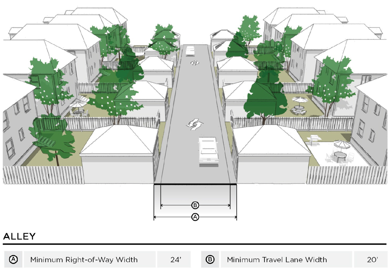 Alleys are a paved vehicular drive located to the rear of lots providing access to service areas, parking, and outbuildings, and often containing utility easements.