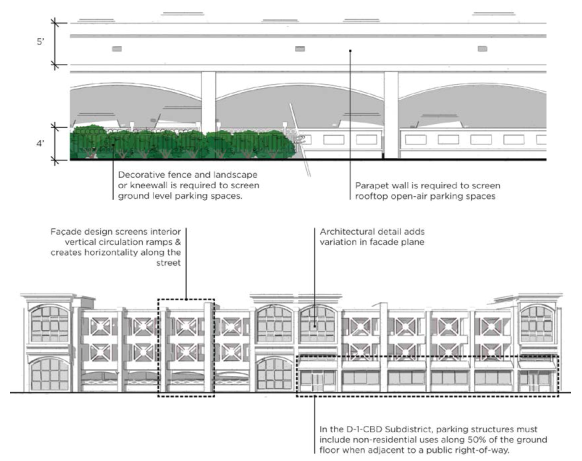 With the exception of the D-1 District, off-street parking is required for a farmers' market; no off-street parking is required in the D-1 District. One space is required for every 300 square feet of covered area used for the farmers' market. Such off-street parking facilities may be located within 600 feet of the market.
