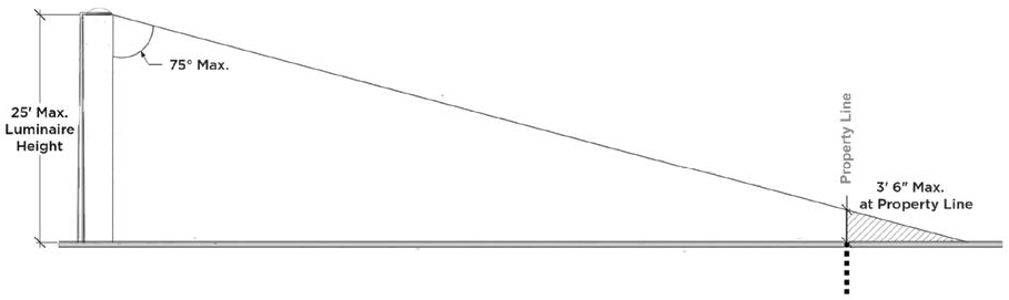 The maximum total height of a cut off luminaire, either freestanding or attached to a structure, is 25 feet. Any luminaire greater than 25 feet in total height requires a variance.