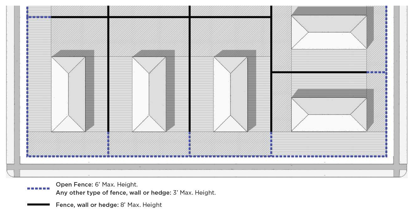 All structures, including a closed fence or wall, and all plantings are limited to a maximum height of three feet within the sight triangle. A semi-open fence that complies with all fence requirements that does not impair the sight triangle is permitted.