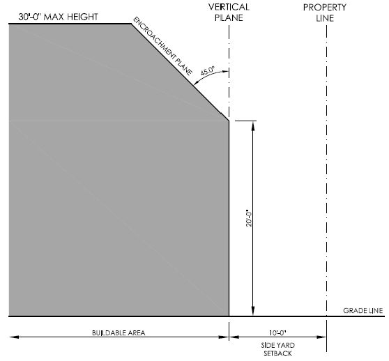 Angle-plane: For yards abutting an R-1 zoned lot, an encroachment limit shall be established which is determined at a point twenty feet above the existing ground level at the setback line as required by subsection D above, and using a forty-five-degree angle inwards toward the property to create additional setback (see illustration below).