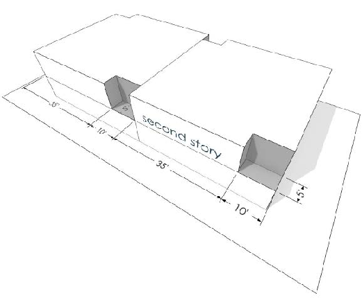 Articulation: Articulation of exterior walls is encouraged. In no event shall a linear wall of a second story extend longer than thirty-five feet without an offset of a minimum of five feet for a minimum linear distance of ten feet (see illustration below).