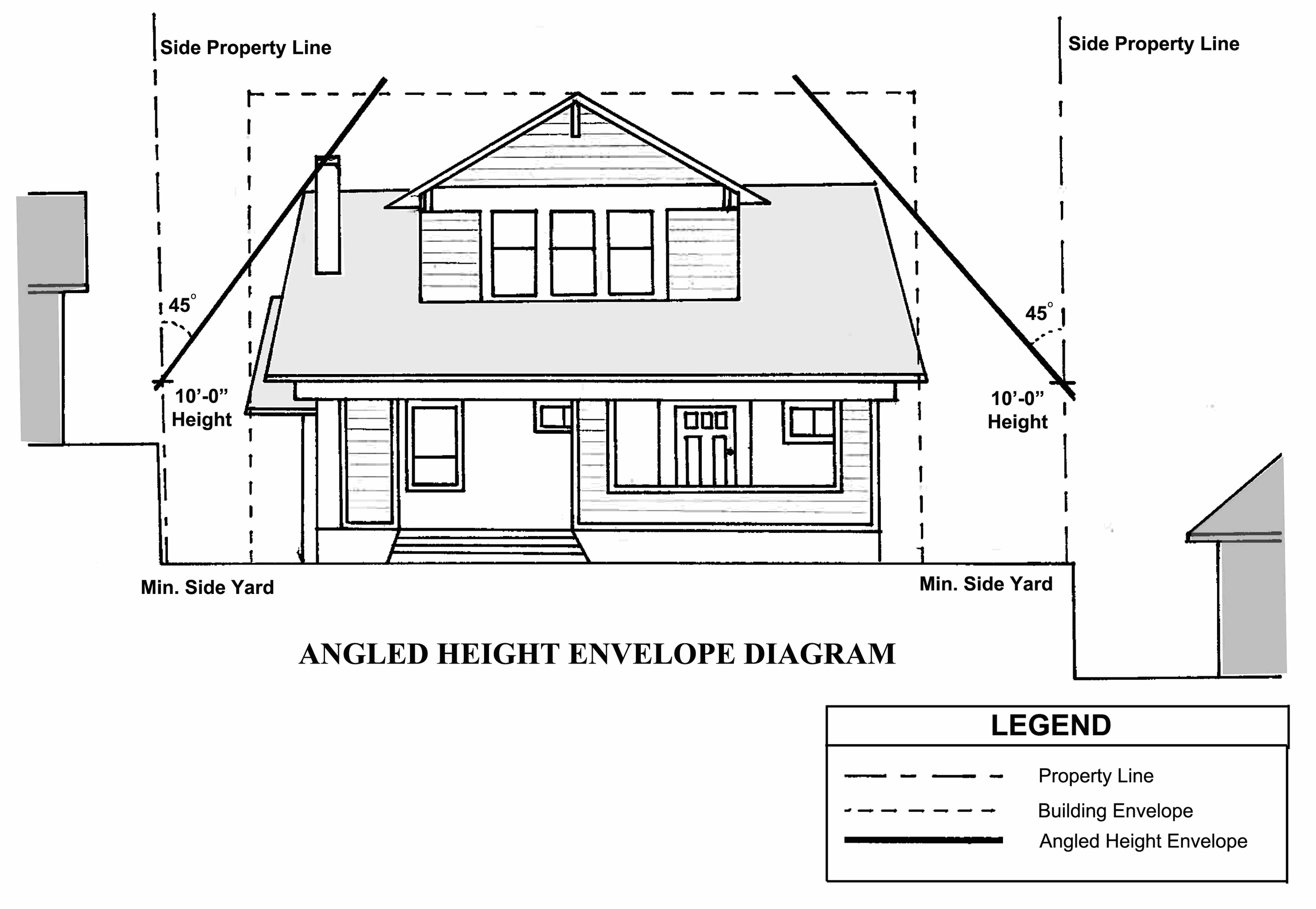 Angle Plane Height. No portion of a building, except a chimney, shall exceed the height of a forty-five degree plane drawn from a height of ten feet above existing natural or pre-existing grade at the side lot line boundaries of the lot (see Diagram A). Roof eaves projecting a maximum four feet out from the vertical plane of the exterior wall surface are exempted. Any other encroachments exceeding the angle plane height are allowed only if authorized by an administrative design review issued pursuant to Chapter 17.60. This section shall not prevent the applicability of Section 17.48.120 (Permissible projection of structures into yards).
