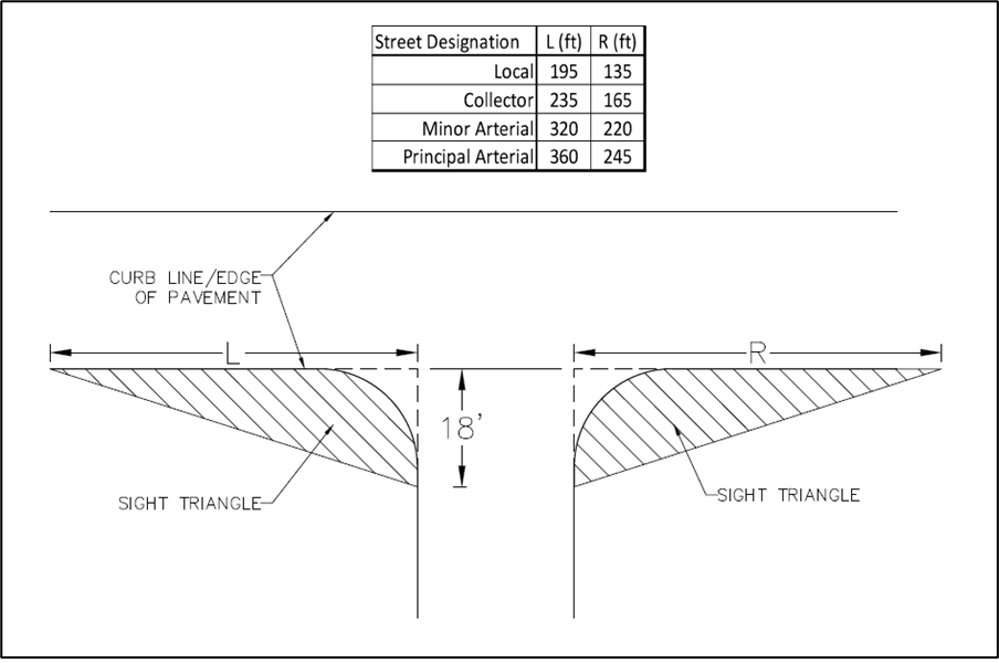 Sight distance triangle means a triangular area at the corner between any two intersecting streets, as depicted in the diagram below this definition, where: (1) the apex of the triangle is the point of intersection of the two street curb lines/edge of pavements; (2) the shorter leg of the triangle, which is parallel to a vehicle stopped at a traffic signal, device, or stop sign, is extended 18 feet from the apex along the abutting curb or edge of roadway pavement; (3) the longer leg (either right or left side) is measured perpendicular to the said stopped vehicle, measured abutting the curb or edge of roadway pavement at the distance based on the street class designation as shown in the chart in the diagram below this definition; and (4) the hypotenuse joins the ends of the triangle legs. No stationary object, either permanent or temporary, taller than 30 inches, as measured from the pavement elevation upon which a motor vehicle rests, shall be permitted within the sight distance triangle other than traffic control devices, or structures, erected by, or for the purpose of, a governmental entity.