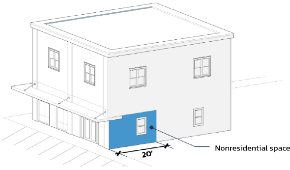 The principal nonresidential space shall have a minimum depth of 20 feet measured from the front of the building to the inside wall opposite of the street frontage. The remaining ground floor area and upper stories may contain residential dwelling units.