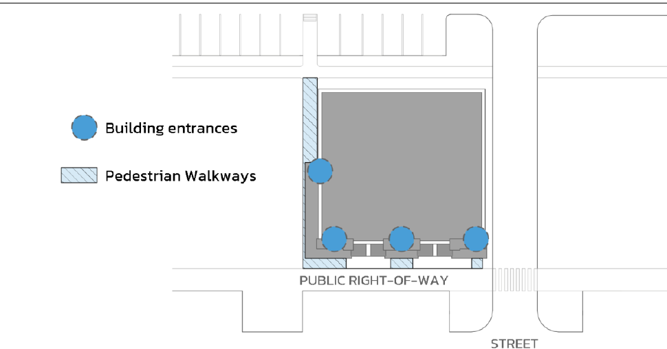 There shall be a walkway from the perimeter public sidewalk or street to the primary building entrance. Walkways shall be constructed with using firm, stable, and slip resistant surface.
