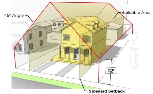 A bulk plane analysis shall be applied to define the three-dimensional area to which development will be limited. The bulk plane extends up 12 feet from all four lot lines and angles in at 45 degree angles from the side lot lines until it reaches the maximum building height in the zoning district or intersects with the plane that is created by the lot line on the opposite side of the lot. The buildable area, or area in which development may occur, consists of the area within the required front, side and rear yard setback and the defined bulk plane.