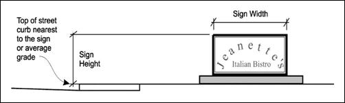 Sign height. Sign height shall be measured as the vertical distance from the top of the adjacent curb elevation to the highest point of the structure, or average grade, whichever is less, as shown in Figure 3-13.