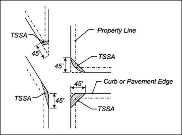 Traffic Safety Sight Area (TSSA). Area that includes that portion of both public and private property located at any corner and bounded by the curb line or edge of roadway of the intersecting streets and a line joining points on the curb or edge of roadway 45 feet from the point of intersection of the extended curb lines or edges of roadway.