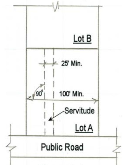 Private servitude of passage means a strip of ground to be reserved by the developer for private access by owners of other lots connected to this servitude, the title to which shall remain in the possession of the property owner, subject to the right of use of passage. No public access is allowed. Servitude will not be maintained by the town. A private servitude of passage shall be at least 25 feet in width. The minimum width of a lot at any point perpendicular to a private servitude of passage shall be 100 feet.